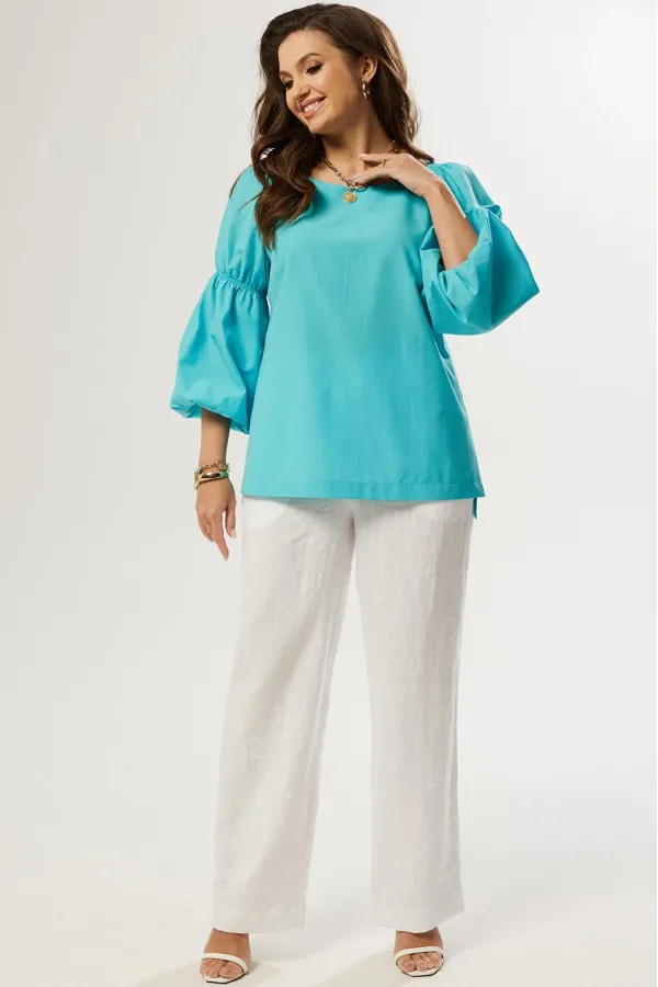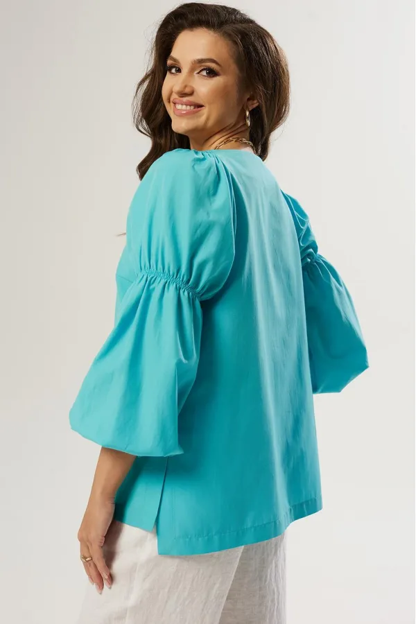 Блуза свободного силуэта, рукав реглан, в рукаве на плече, выше локтя и по низу резинка. Передняя часть короче спинки и в боковых швах обработаны шлицы. Горловина лодочка.