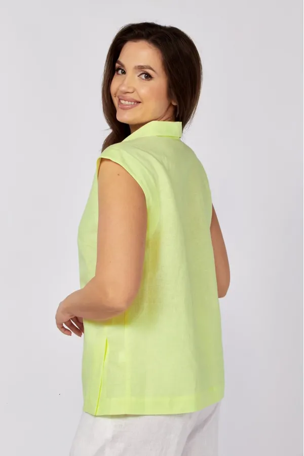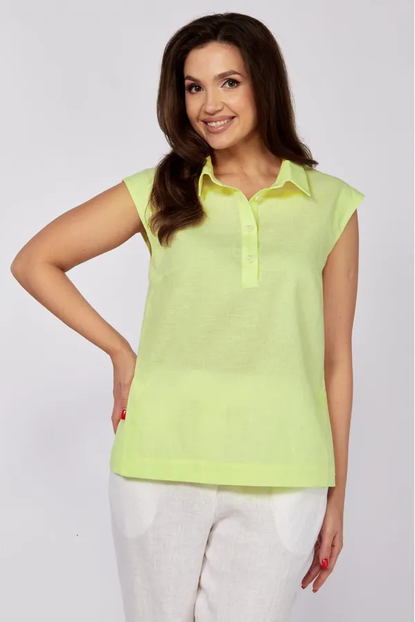 Блуза полуприлегающего силуэта, плечо слегка спущено. В боковой части переда шлицы по низу, застегивающиеся на 4 пуговицы, воротник отложной со стойкой.