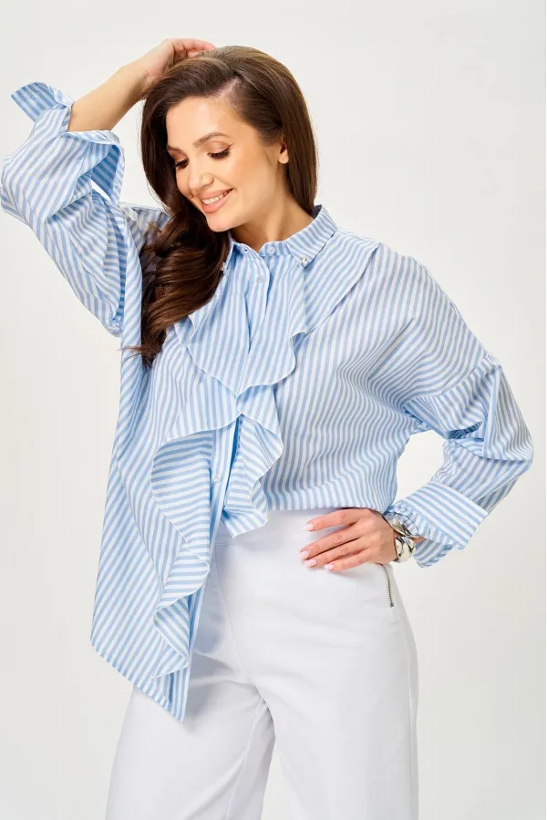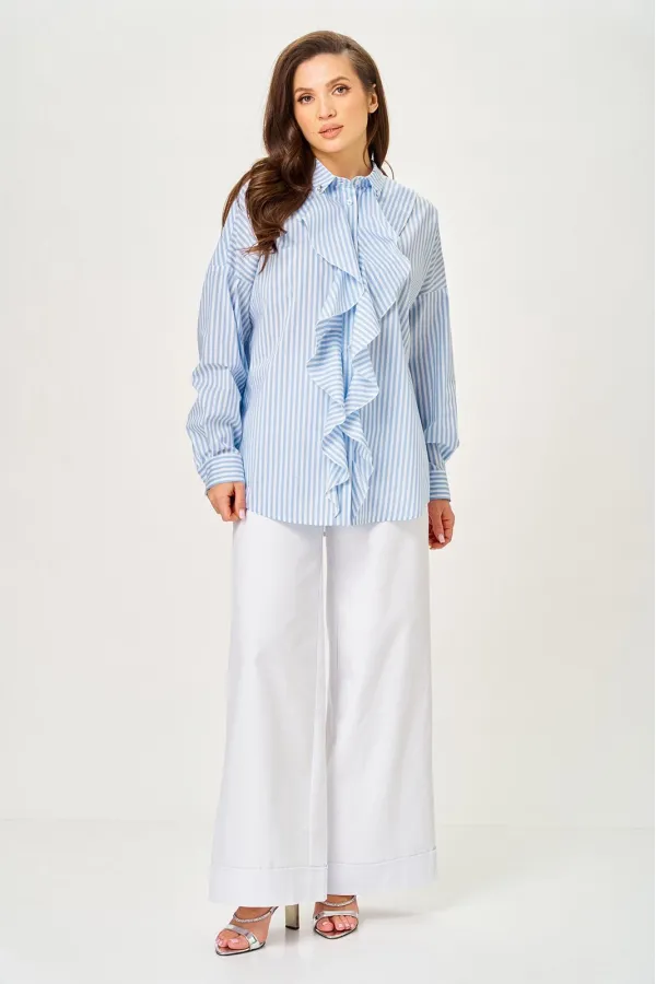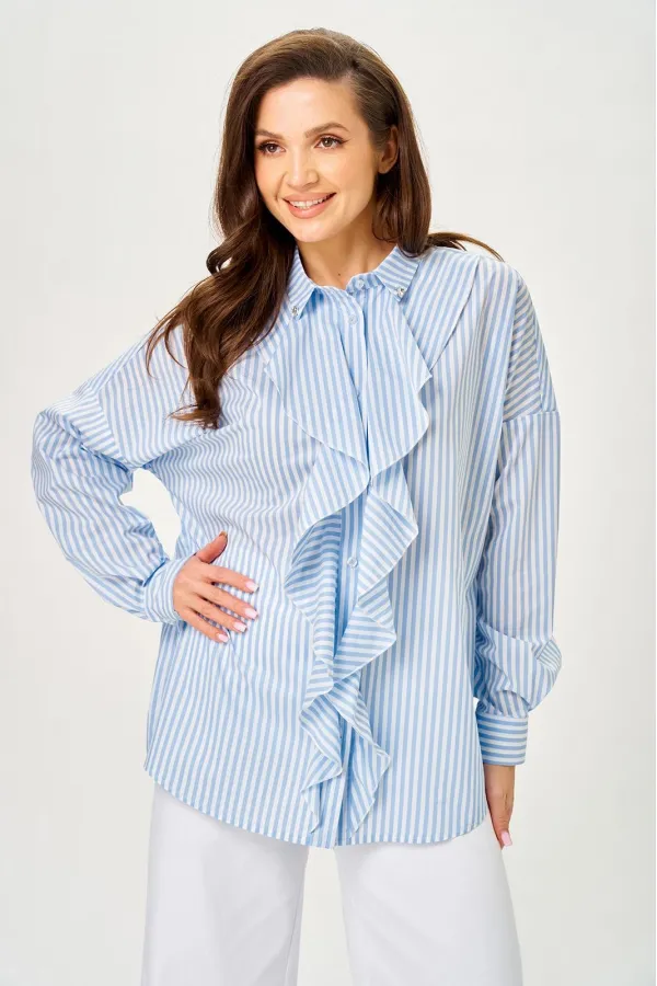 Главный акцент модели — мягкий архитектурный волан по переду. Он добавляет движению ткани лёгкость и делает рубашку более женственной и выразительной.