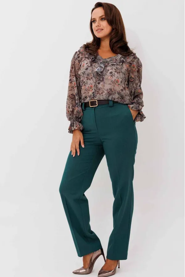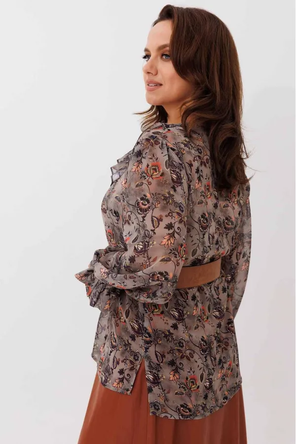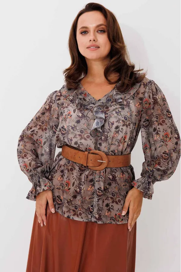 Блуза женская, рукав втачной со сборкой по окату. Рукав расширяется к низу. V-образный вырез с двойным воланом. Низ рукава обработан манжетой на венгерке. В комплекте топ хлопка(100%) на регулируемых бретелях.