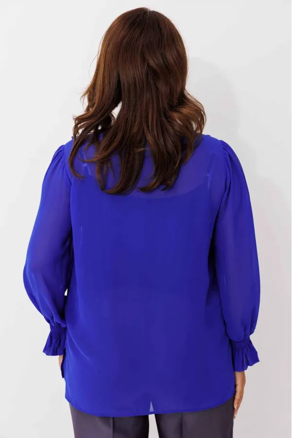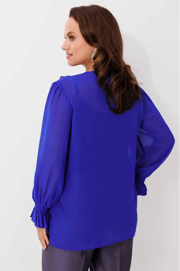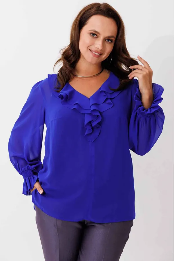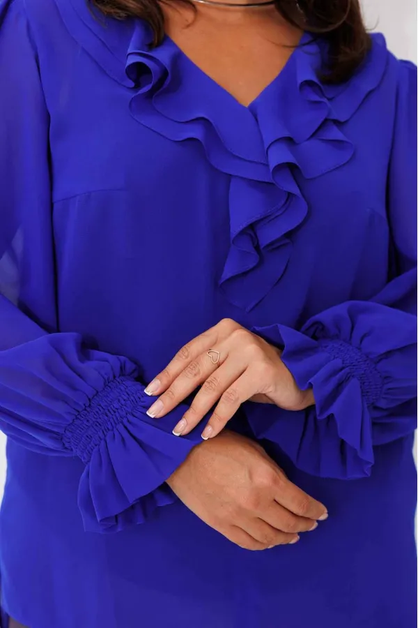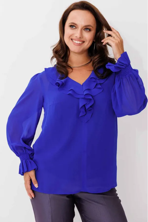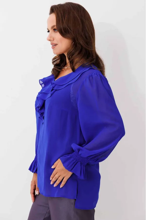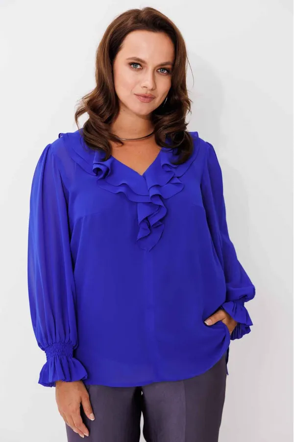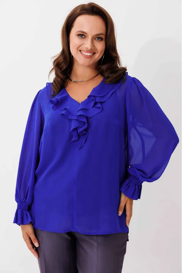Блуза женская, рукав втачной со сборкой по окату. Рукав расширяется к низу. V-образный вырез с двойным воланом. Низ рукава обработан манжетой на венгерке. В комплекте топ хлопка(100%) на регулируемых бретелях.