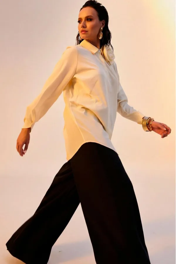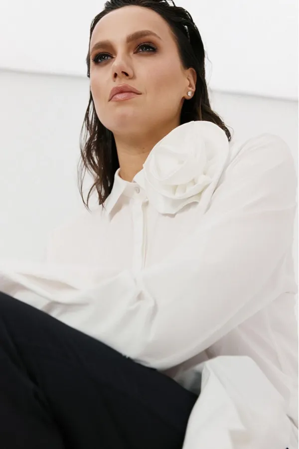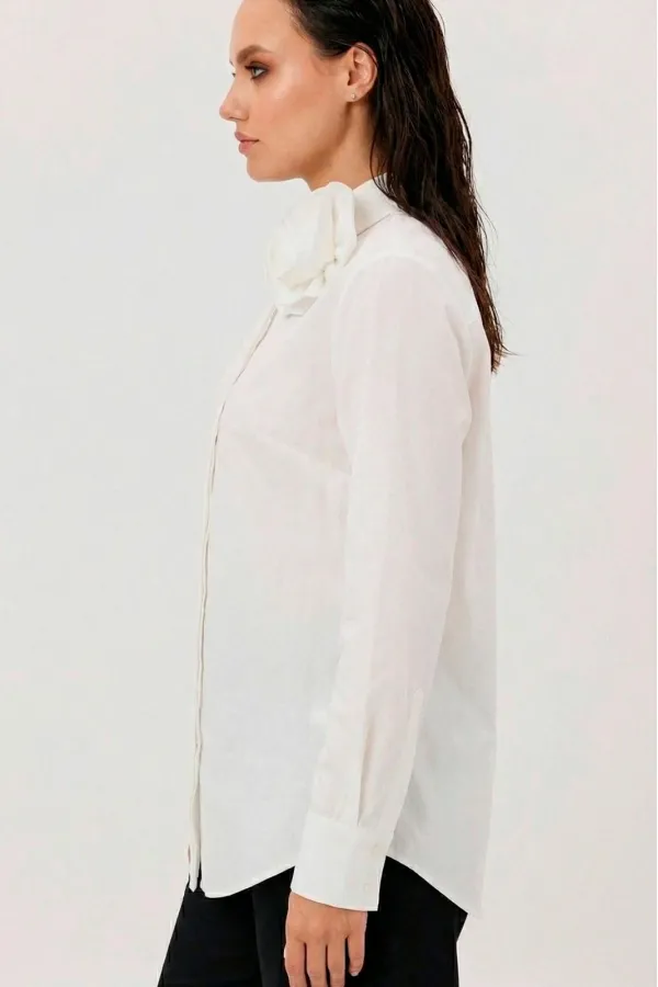 Блуза женская, прямого силуэта с потайной застежкой. Перед с нагрудными вытачками. Спинка с отрезной кокеткой. Воротник рубашечного типа, с отрезной стойкой. Рукав тачной, одношовный, с манжетой по низу. Низ фигурный. Декоративный цветок (съемный, пуговица)