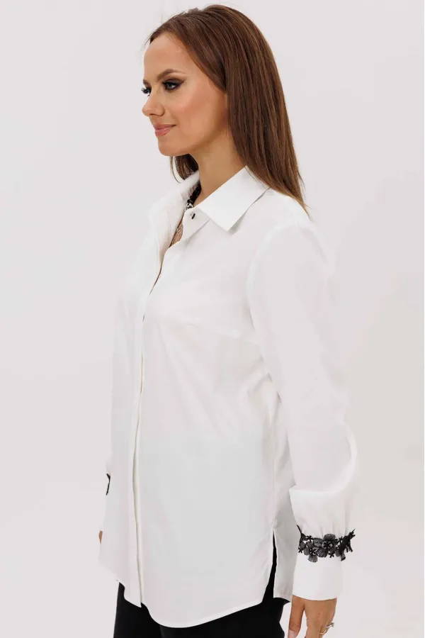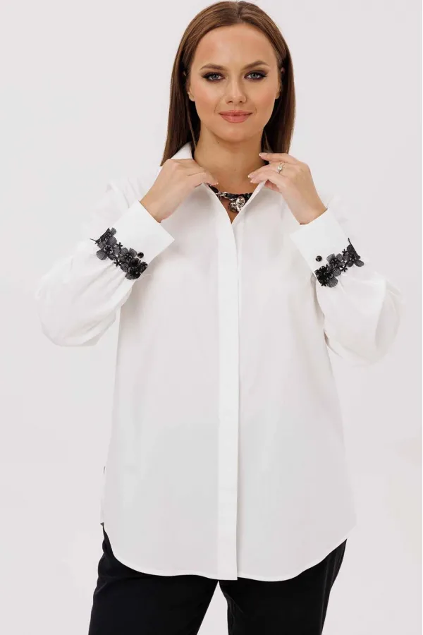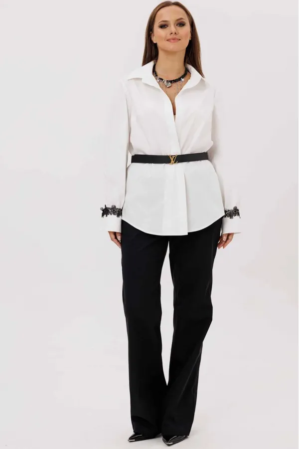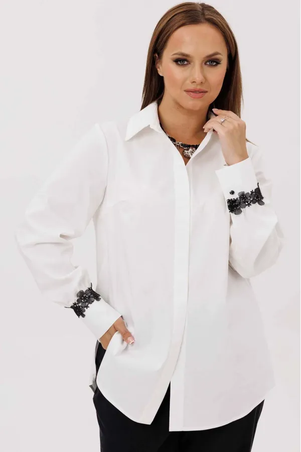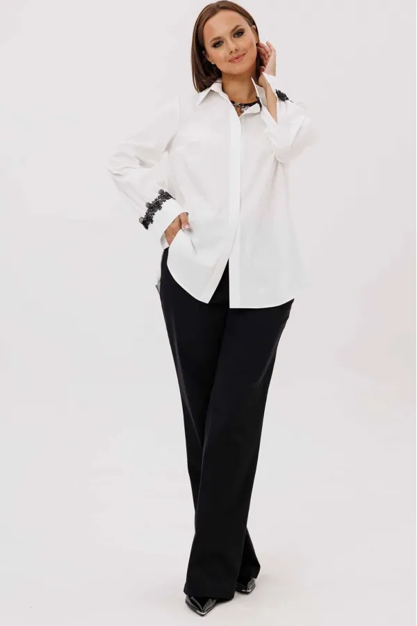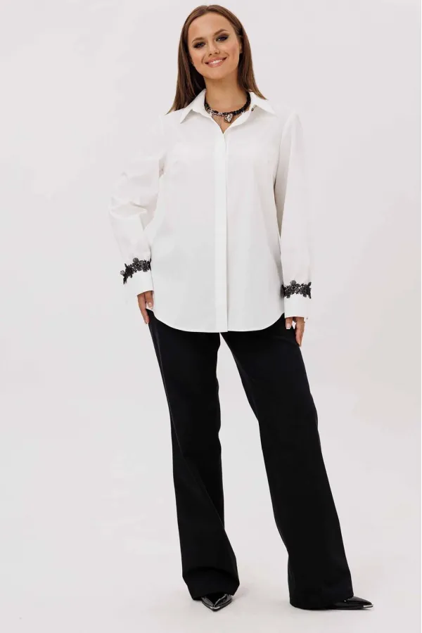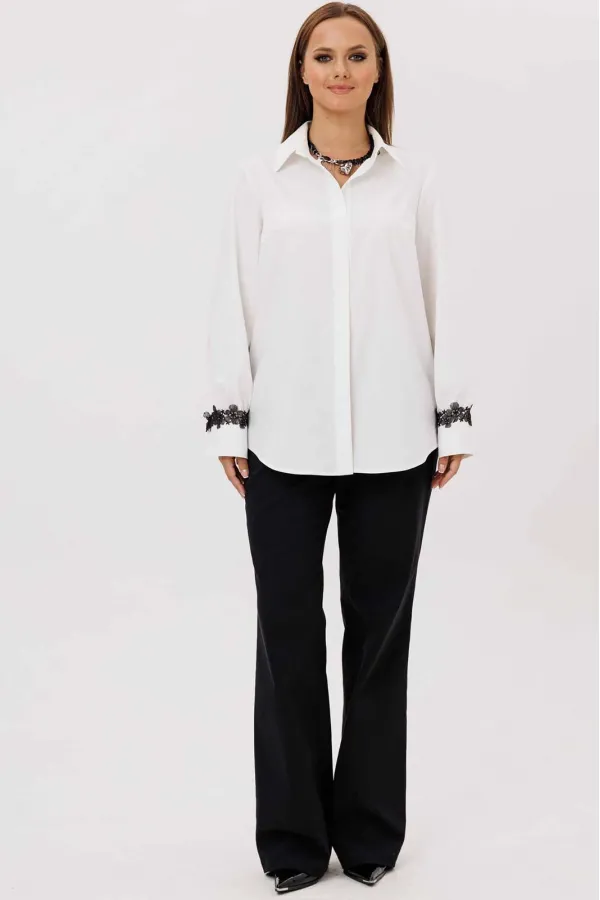 Блуза женская, прямого силуэта с потайной застежкой. Перед с нагрудными вытачками. Спинка с отрезной кокеткой. Воротник рубашечного типа, с отрезной стойкой. Рукав тачной, одношовный, с манжетой по низу. Низ фигурный. Манжеты украшены декоративной тесьмой-кружевом.