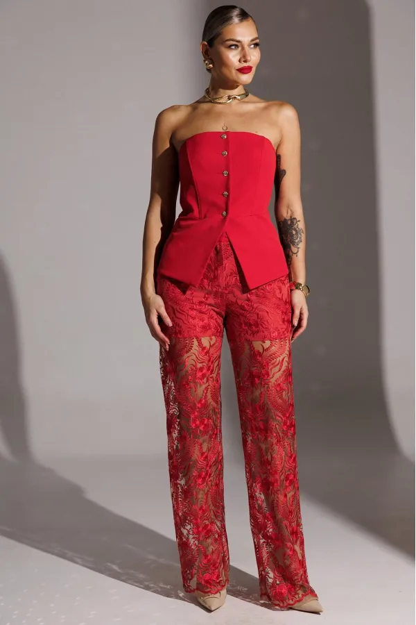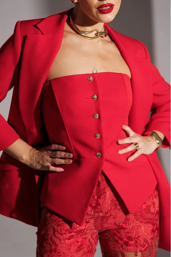 Капсула R E D C O D E - Ваша формула смелого праздника. Она создана для особых случаев включает в себя жакет, корсет и брюки, создавая элегантный и стильный образ. Корсет приталенного силуэта с центральной застежкой на пуговицы, идеально подчеркивающий фигуру и создающий элегантный контур. В вертикальные рельефы по переду и спинке, а также в боковые швы вставлен регилин, что обеспечивает дополнительную поддержку и формирует красивую линию талии. Низ корсета имеет фигурную форму, добавляя изысканности и утонченности. Корсет выполнен на подкладке, что гарантирует комфорт при носке и улучшает посадку на теле.