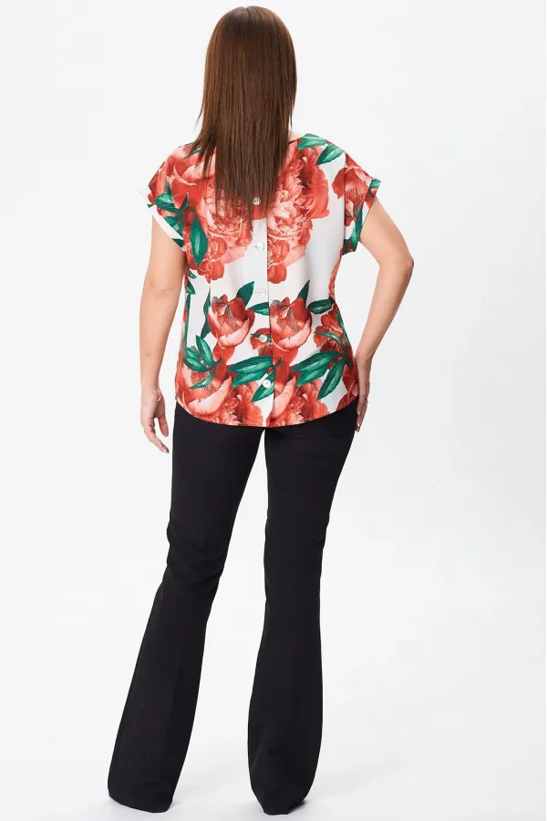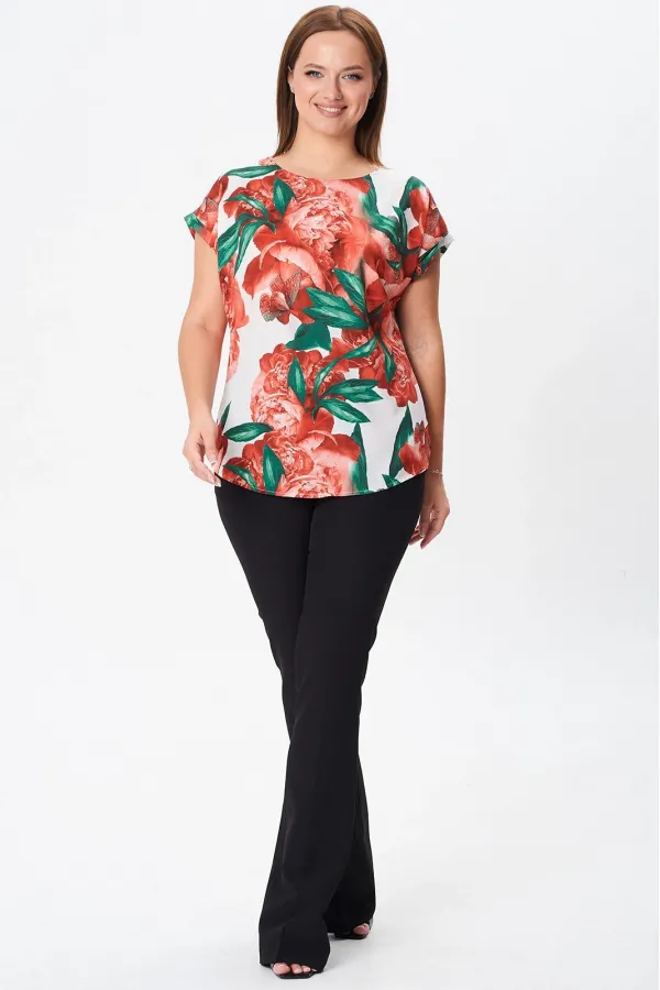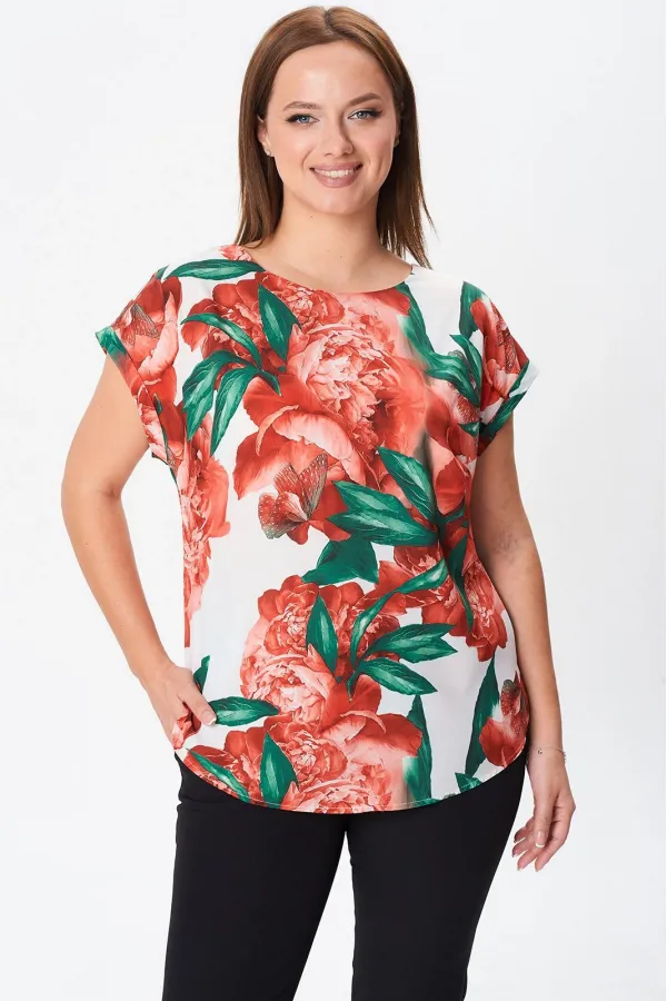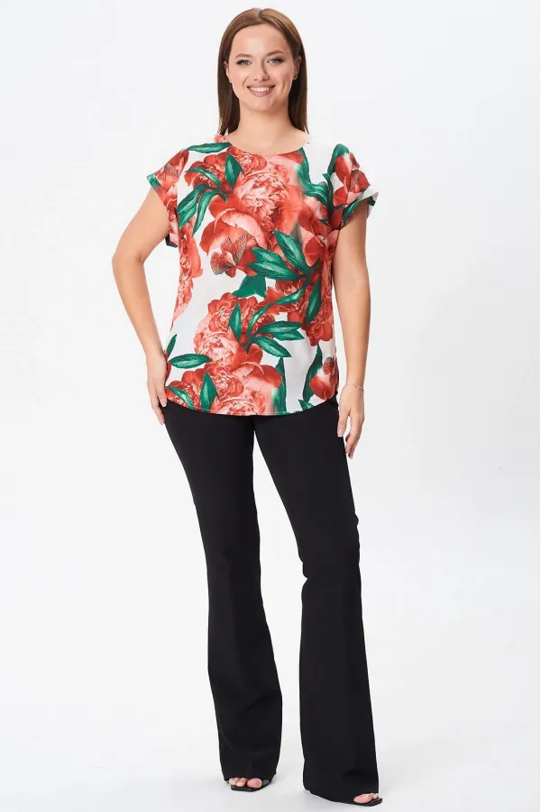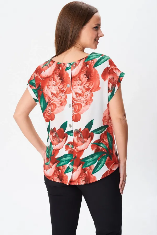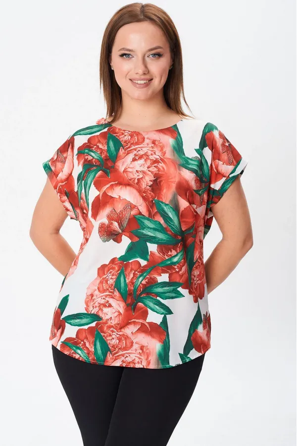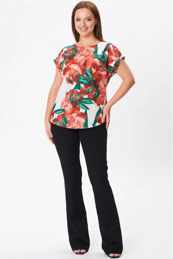 Блуза женская свободного силуэта со спущенной линией плеча и коротким рукавом. Перед блузы цельнокроеный с нагрудной вытачкой. Спинка с застежкой по центру до низа на декоративные пуговицы. Горловина округлой формы. По б... Читать далее...