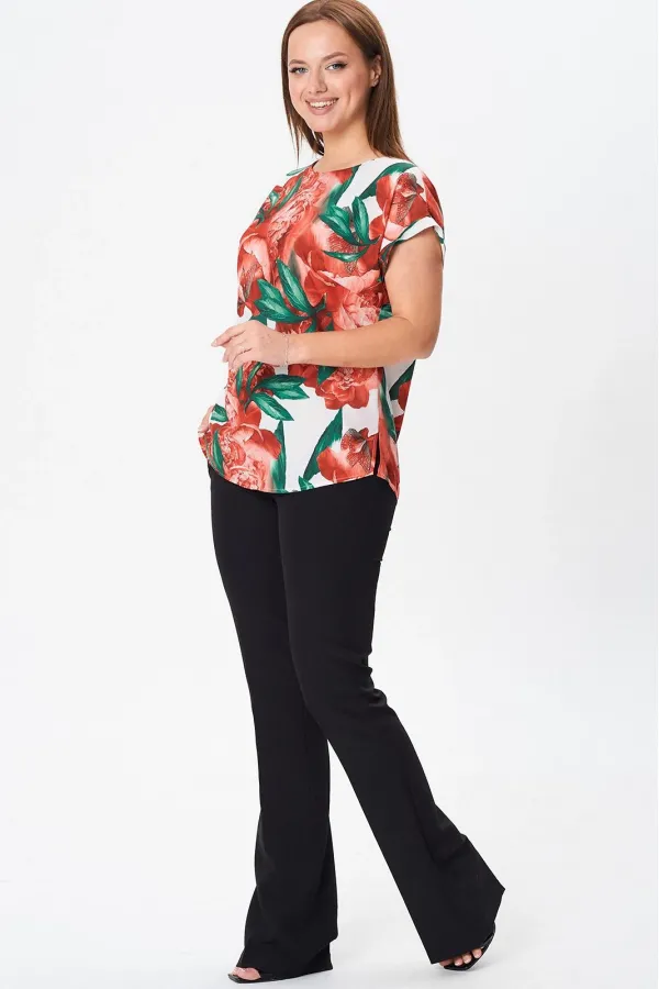 Блуза женская свободного силуэта со спущенной линией плеча и коротким рукавом. Перед блузы цельнокроеный с нагрудной вытачкой. Спинка с застежкой по центру до низа на декоративные пуговицы. Горловина округлой формы. По боковым швам внизу разрезы. По краю проймы рукава притачана отложная манжета.