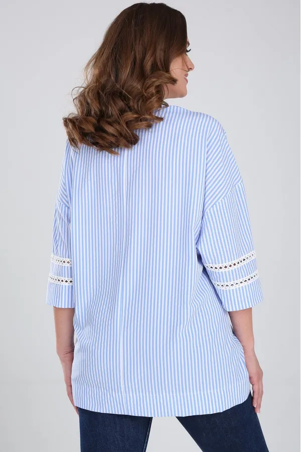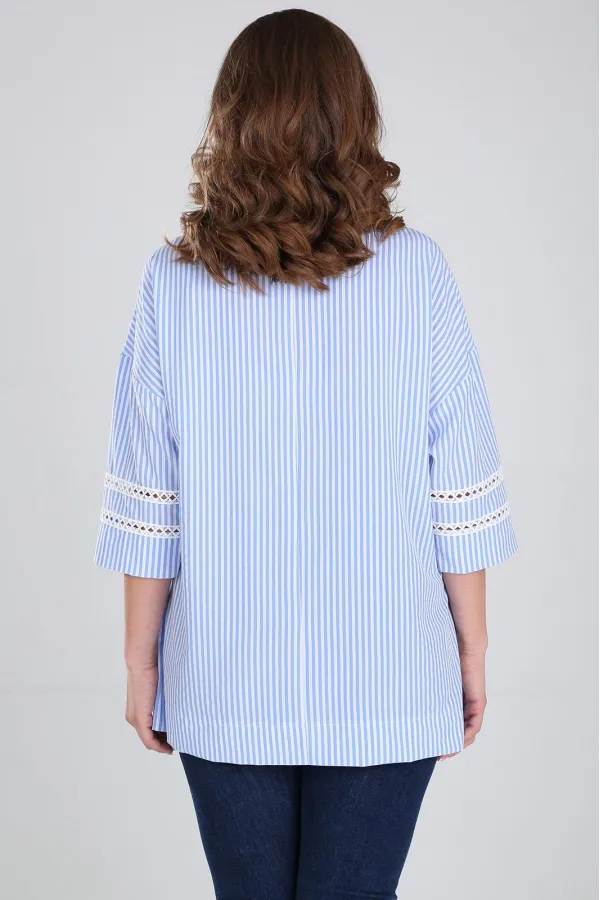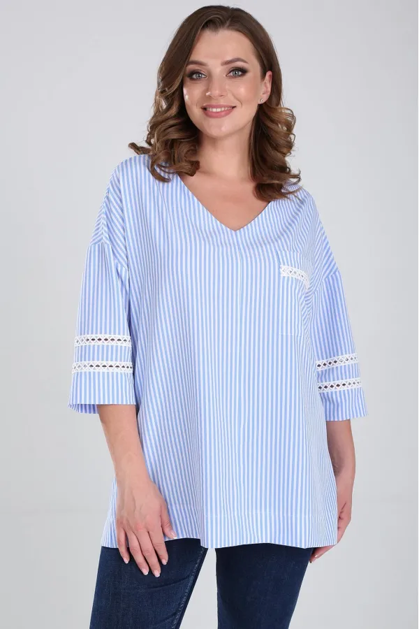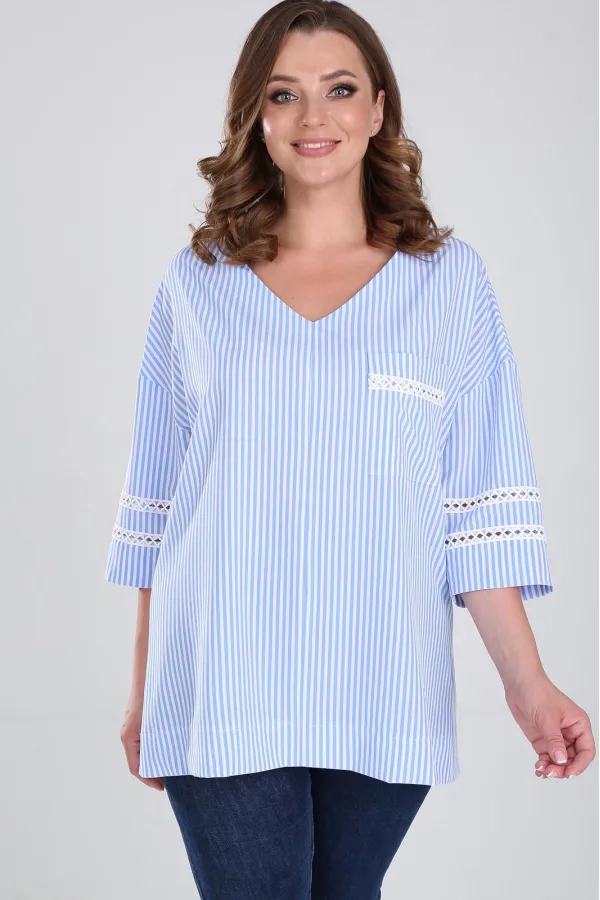 Стильная блузка свободного покроя с V-образным вырезом горловины. Линия плеча спущенная, рукав длинной за локоть. Блузка с накладным карманом слева. Рукава и карман декорированы кружевной лентой. По низу изделия широкая... Читать далее...