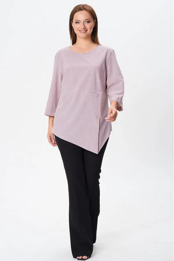 Стильная блузка с круглым вырезом горловины и нагрудными вытачками. По переду и спинке отрезная по линии талии. Нижняя часть блузки с ассиметричным фигурным низом как спереди, так и сзади и функциональной застежкой на петли пуговицы. Рукав в тачной длинной за локоть.Подробные замеры смотрите на дополнительном фото.