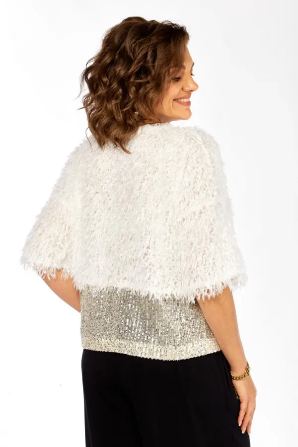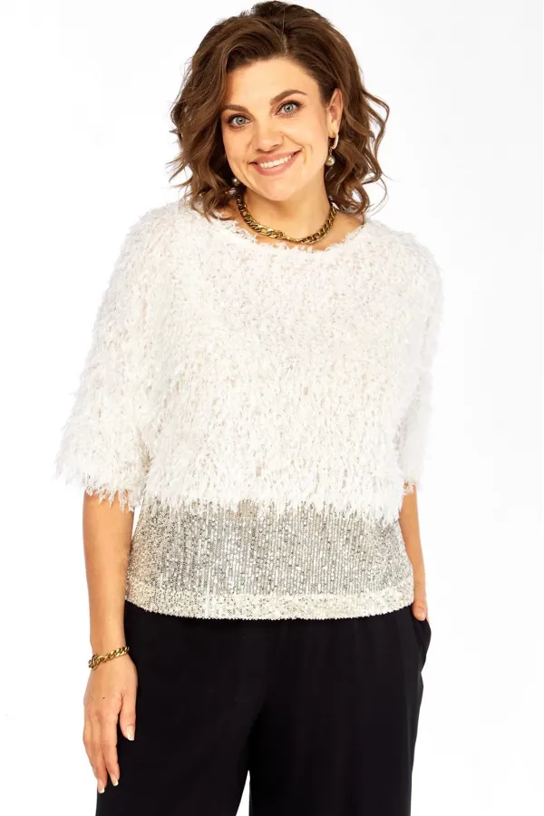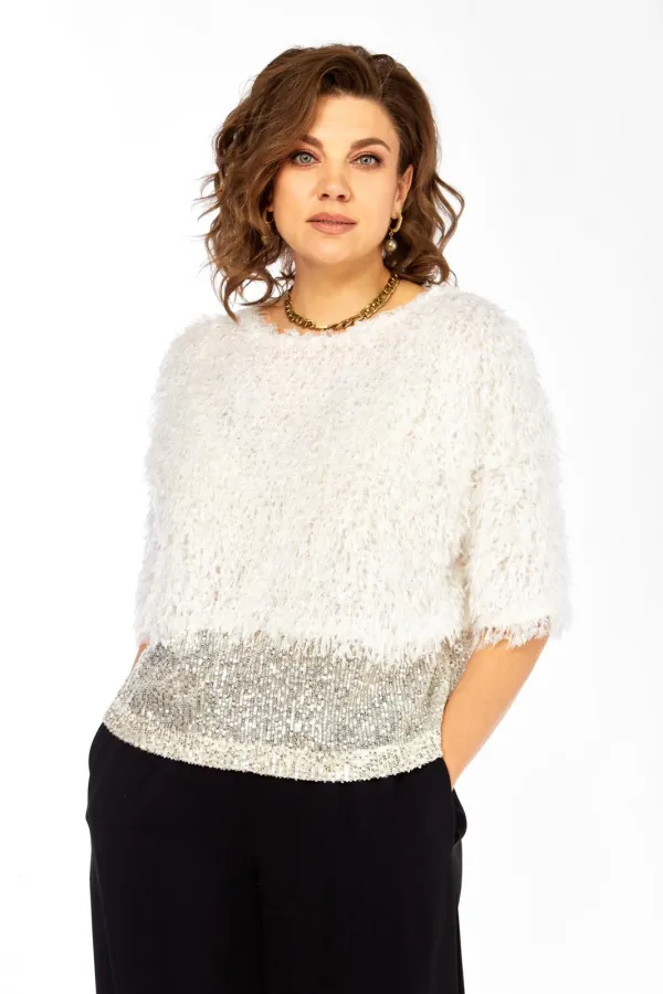 Блузка нарядная прямого силуэта, из интересной ткани с бахромой и отделкой из паеток. Вырез горловины округлой формы, со спущеныным рукавом длиной 3/4