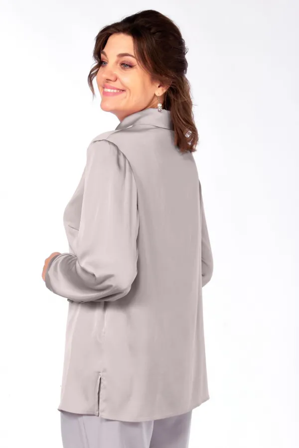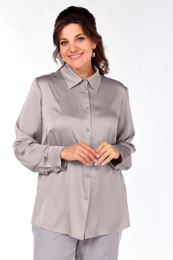 Шикарная блузка из струящейся ткани с матовым блеском, рубашечным воротником и застежкой на петли и пуговицы, нагрудными вытачками. Рукав длинный на манжете, застегивающийся на пуговицы. По боковым швам разрезы.