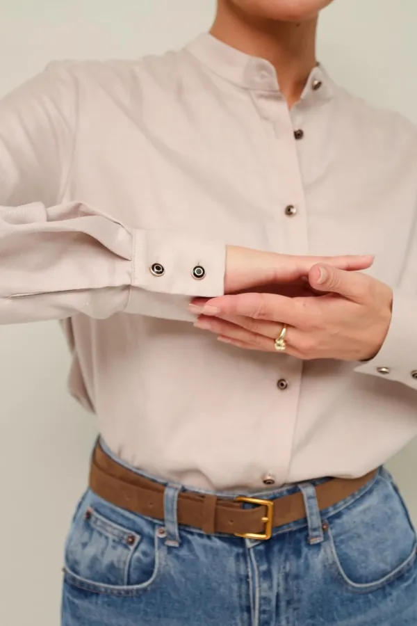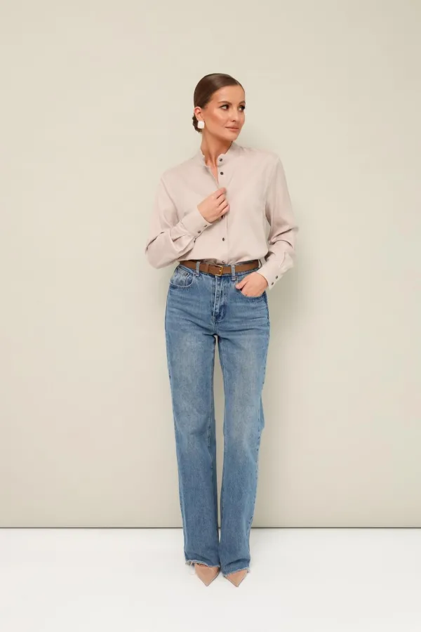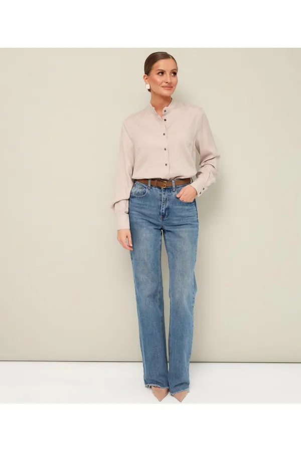 Стильная и комфортная блузка, выполнена из натуральной вискозной ткани. Блузка прямого кроя, горловина со стойкой, центральная застежка на петли и пуговицы. Рукава втачные с манжетами с застежкой на пуговицы. В боковых швах обработаны высокие разрезы.