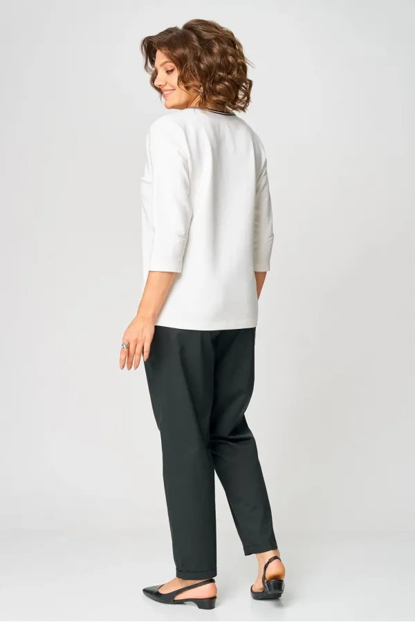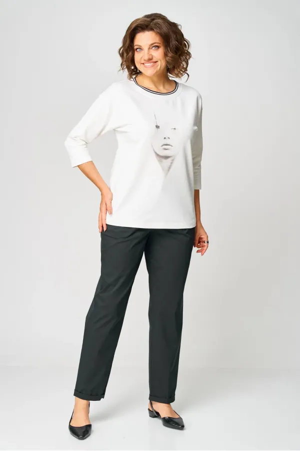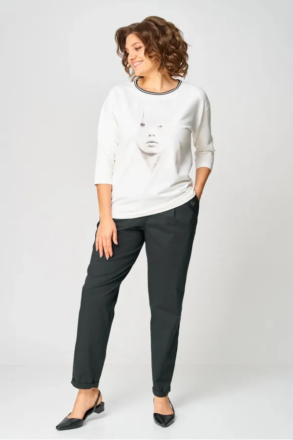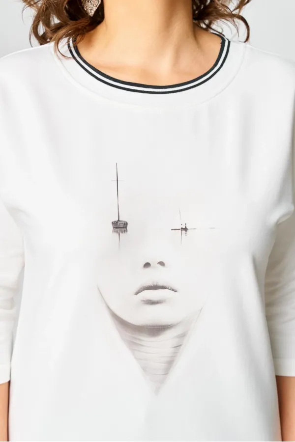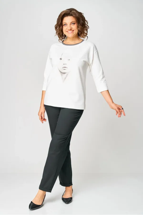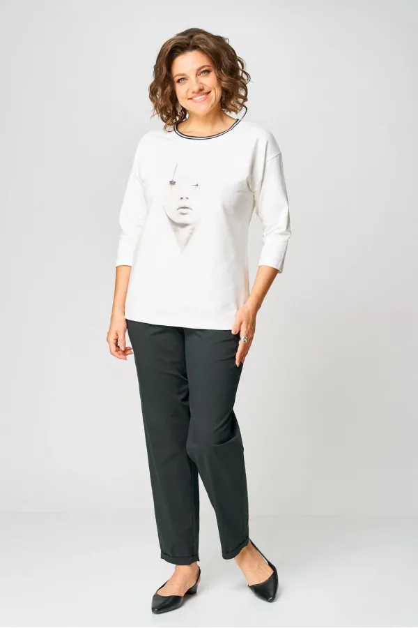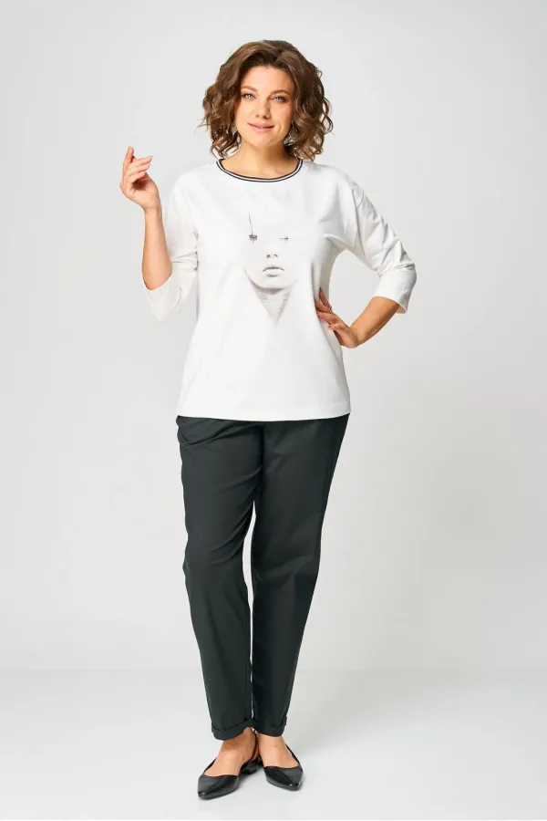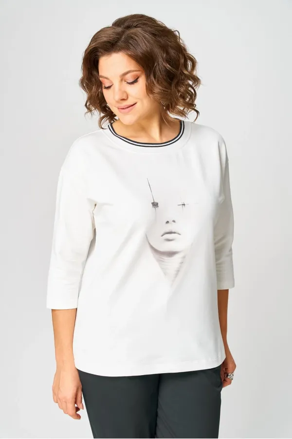 Джемпер из трикотажной ткани (двунитка). Спущенное плечо. Рукав 3/4. Перед футболки с принтом. Вырез горловины круглый, обработан довязом. Спинка без среднего шва.
