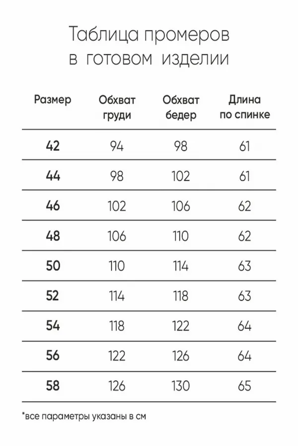 Промеры на примере 50 размера: О Г 104 см(спущенное плечо), О Б 108 см. Длина изделия: 59,5 см