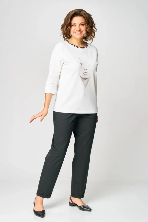Джемпер из трикотажной ткани (двунитка). Спущенное плечо. Рукав 3/4. Перед футболки с принтом. Вырез горловины круглый, обработан довязом. Спинка без среднего шва. Промеры на примере 44 размера: О Г 94 см(спущенное плечо... Читать далее...