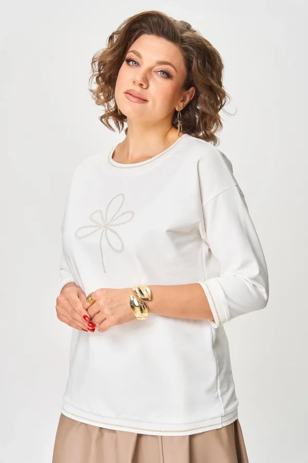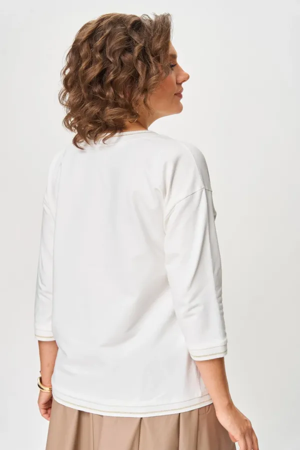 Джемпер женский из трикотажной хлопковой ткани (двунитка). По переду джемпера расположен декоративный элемент из тесьмы. Спущенное плечо, рукав 3/4. Низ рукава, низ изделия и вырез горловины обработаны довязом. Спинка без среднего шва.