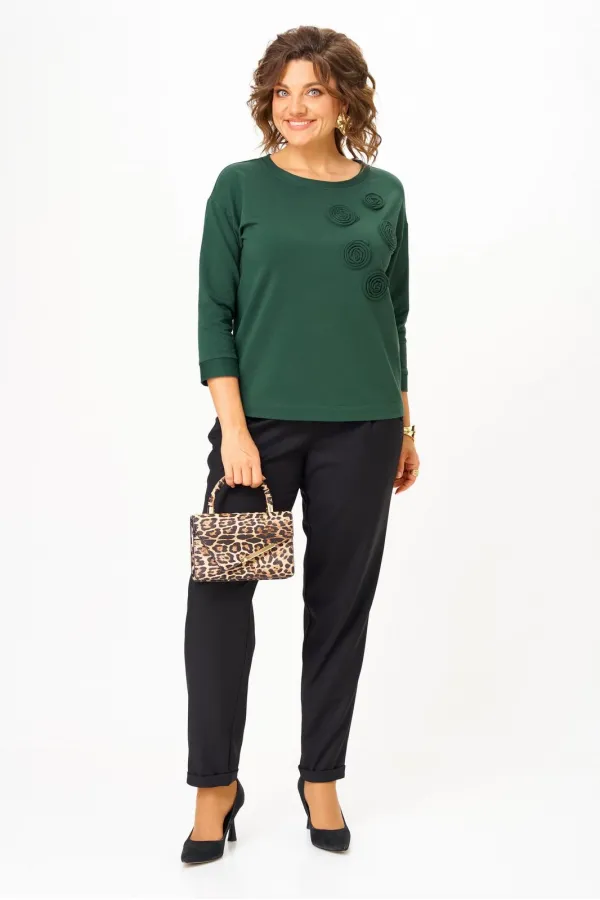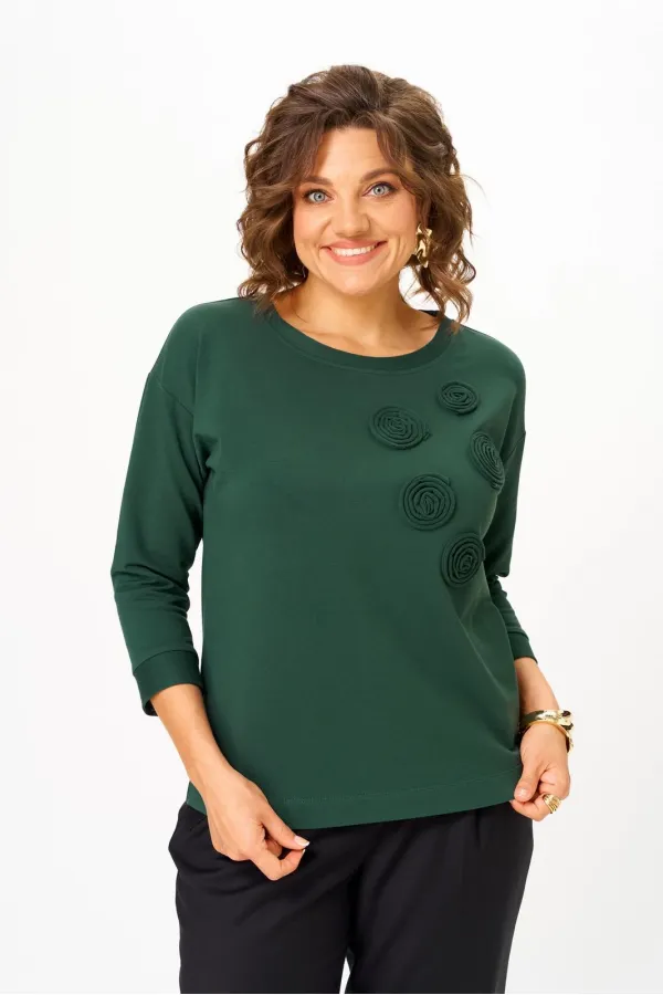 Джемпер женский из трикотажной хлопковой ткани (двунитка). По переду джемпера расположены декоративные элементы. Спущенное плечо, рукав 3/4. Низ рукава обработан манжетой. Вырез горловины круглый, оформлен бейкой.