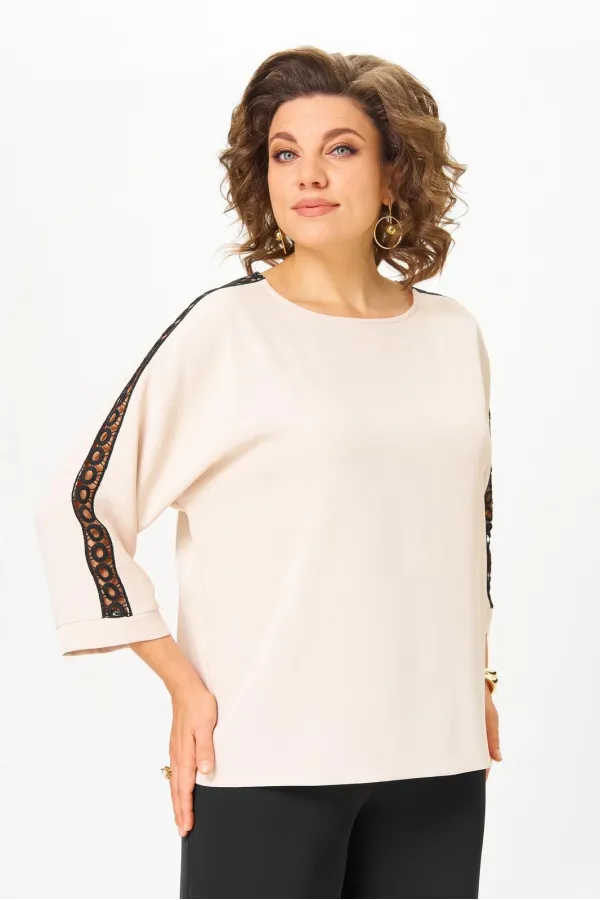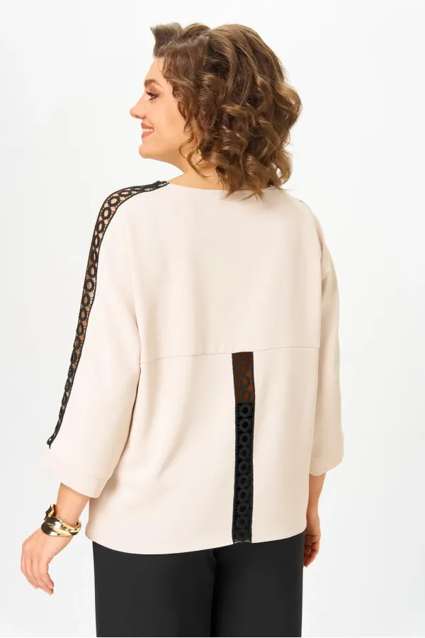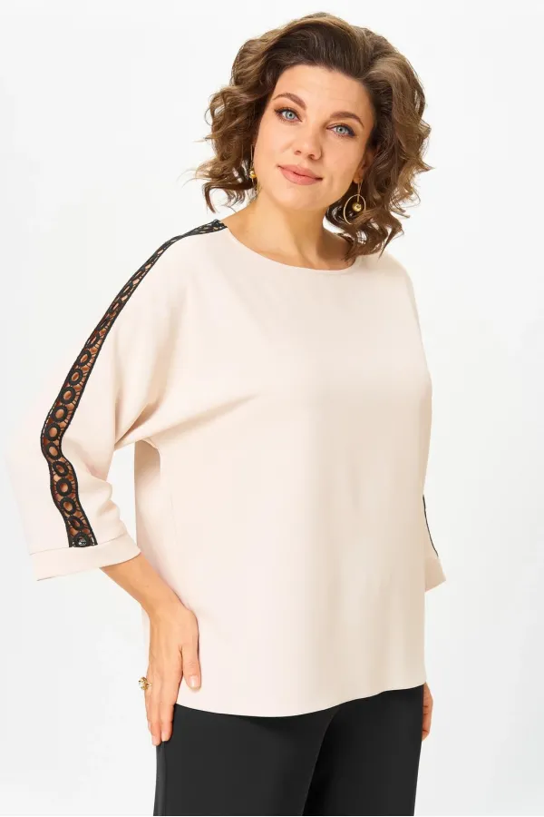 Блузка женская из текстильной ткани с цельнокроеным рукавом. Прямого силуэта. По спинке расположен подрез. В шов вставлено кружево. Рукав 3/4, низ рукава с манжетой. По плечевому шву вставлено кружево. Вырез лодочка. Обработан притачной бейкой.
