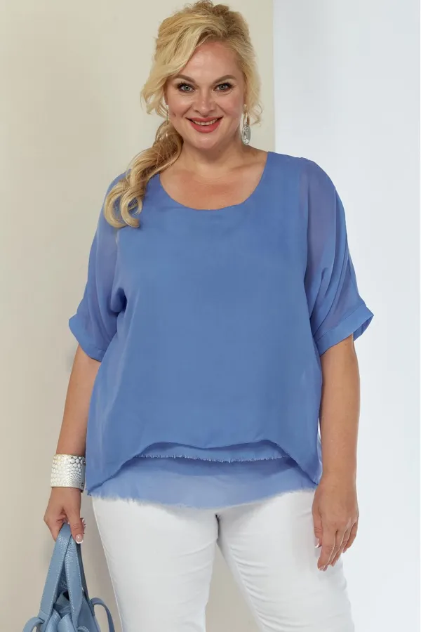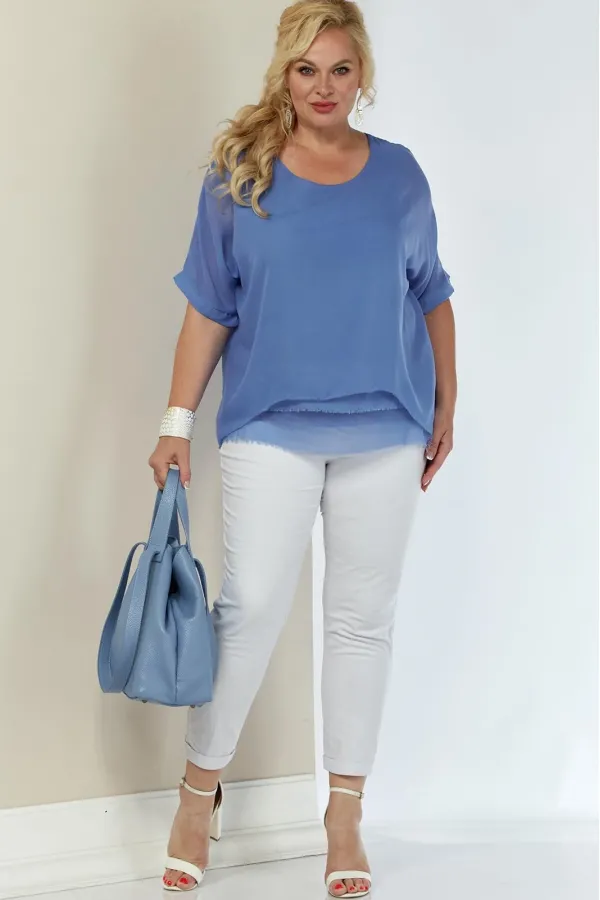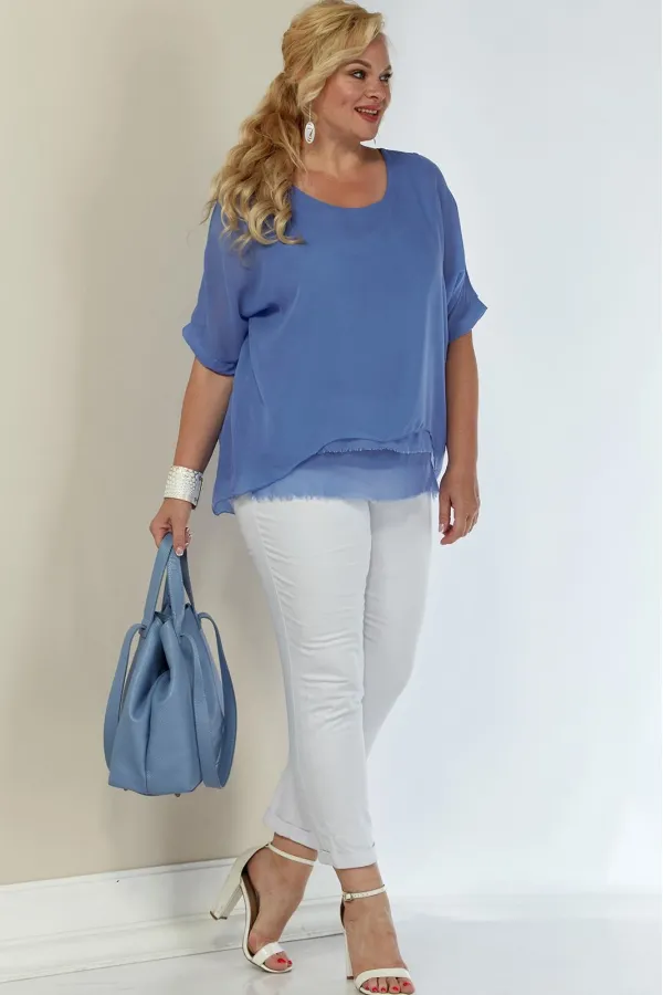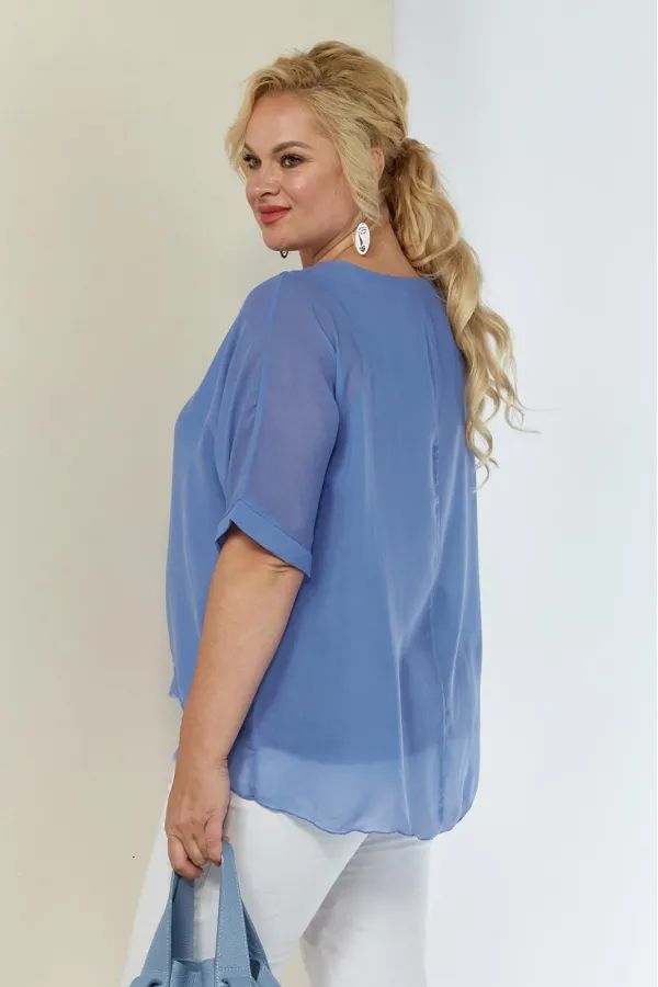 Блуза из мягкой струящейся ткани. Это базовая вещь в вашем гардеробе, которая одновременно может служить нарядной, праздничной, и повседневной вещью. Женская блуза сшита из двух материалов. Основа — мягкая, не просвечиваемая вискоза. Рукава и верхняя часть — шифон. Блуза приятная к телу, не мнется во время носки. Вырез горловины округлой формы. Силуэт свободный. Рукав короткий. Спинка со средним швом. Классический крой блузки будет комфортно сидеть на любом типе фигуры в сочетании с классическими брюками, штанами и юбками.