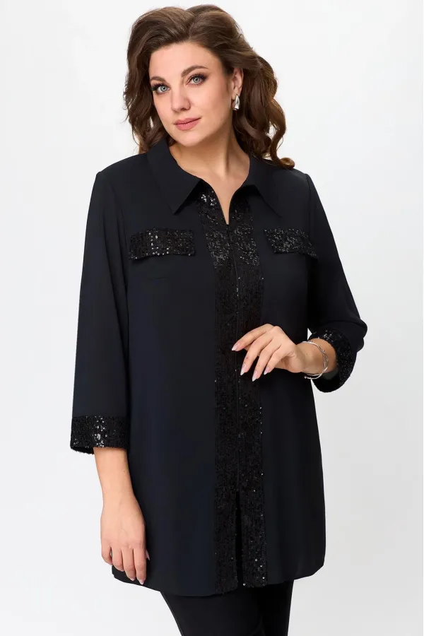 Жакет женский прямого кроя с втачным рукавом. Застежка центральная на молнию. По горловине отложной воротник. По переду декоративные клапаны и планка. По линии груди вытачки. В боковых швах обработаны разрезы. Рукав 7/8 с манжетой. Клапаны, планка по переду и манжеты выполнены из ткани с пайеткой.