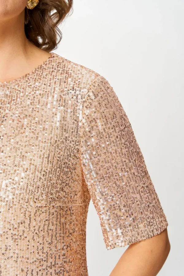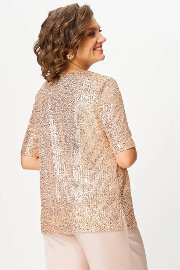 Блузка женская прямого силуэта из ткани пайетка с втачным рукавом. Горловина округлой формы обработана обтачкой. По линии груди вытачки. Рукав длиной до уровня локтя. В боковых шах обработаны разрезы. Перед и спинка блузки на трикотажной подкладке.