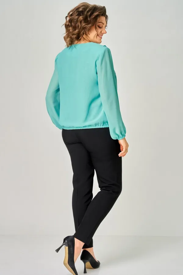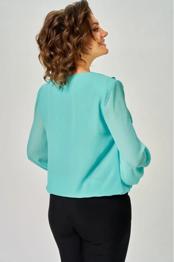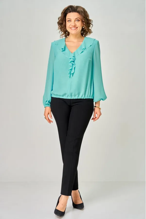 Блузка женская прямого кроя с втачным рукавом. Вырез горловины v- образной формы оформлен воланом переходящим в шов по переду. По линии груди вытачки. Спинка цельная. Рукав длинный расширенный к низу. Низ блузки и рукава собраны на резинку.