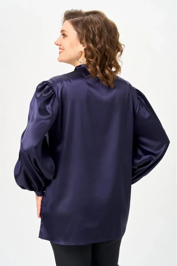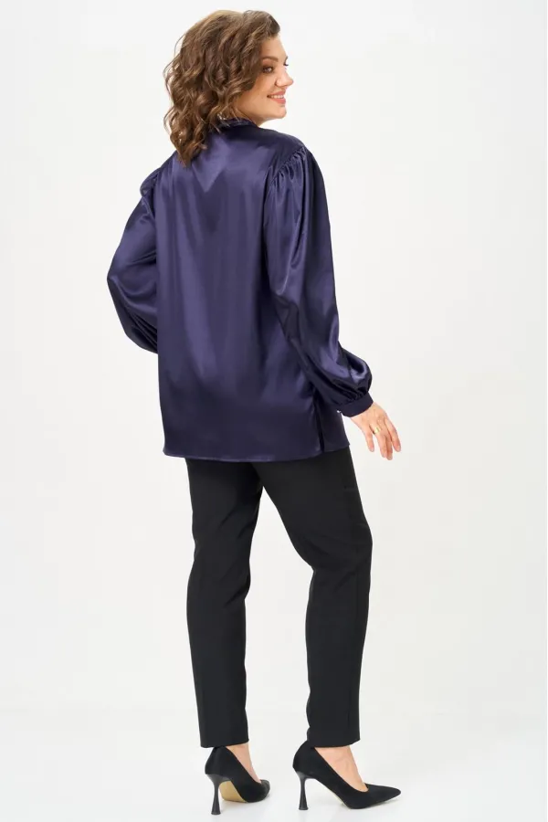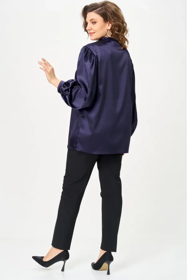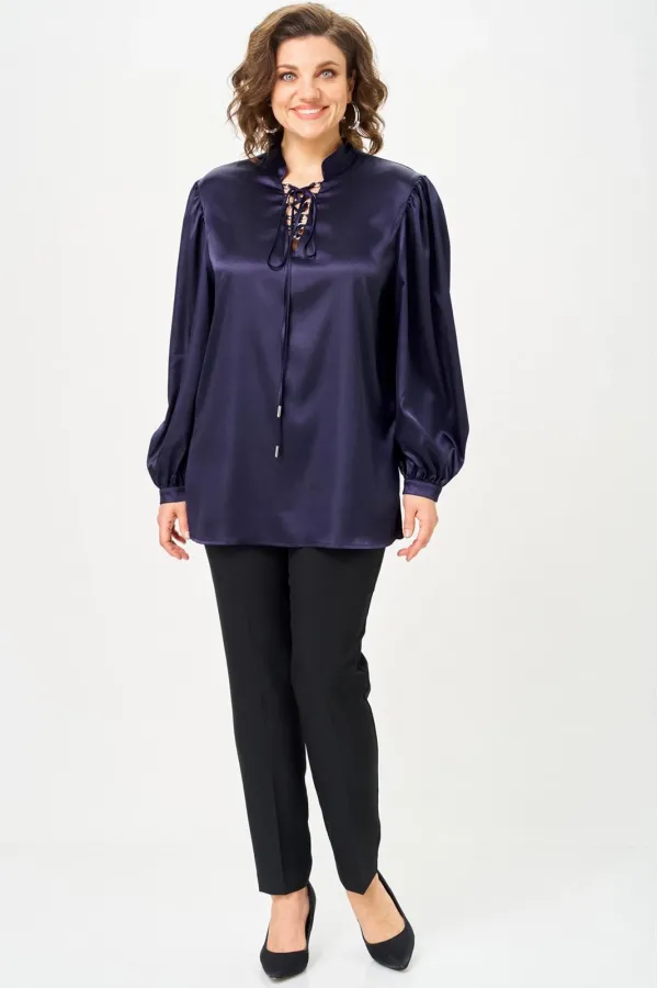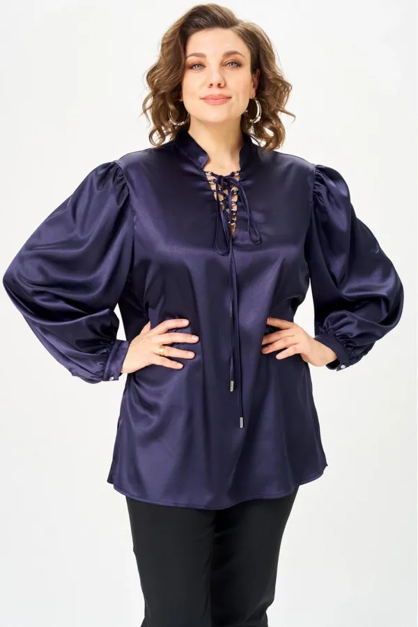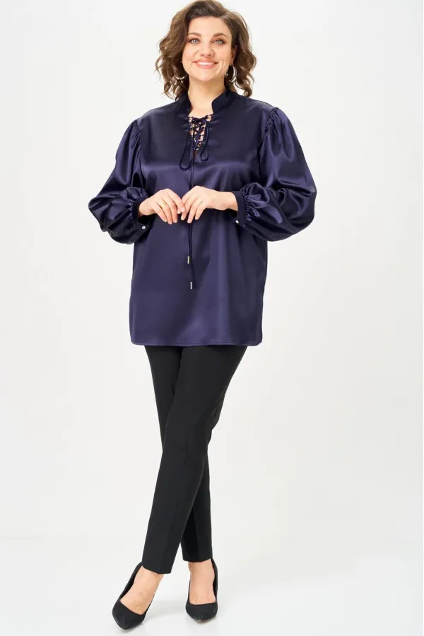 Блузка женская прямого кроя, с втачным рукавом. Горловина v- образной формы с воротником стойкой декорирована контрастной шнуровкой. Спинка цельная. Рукав длинный со сборкой по окату, низ рукава присобран на притачную манжету с застежкой на петлю и пуговицу. В боковых швах обработаны разрезы.