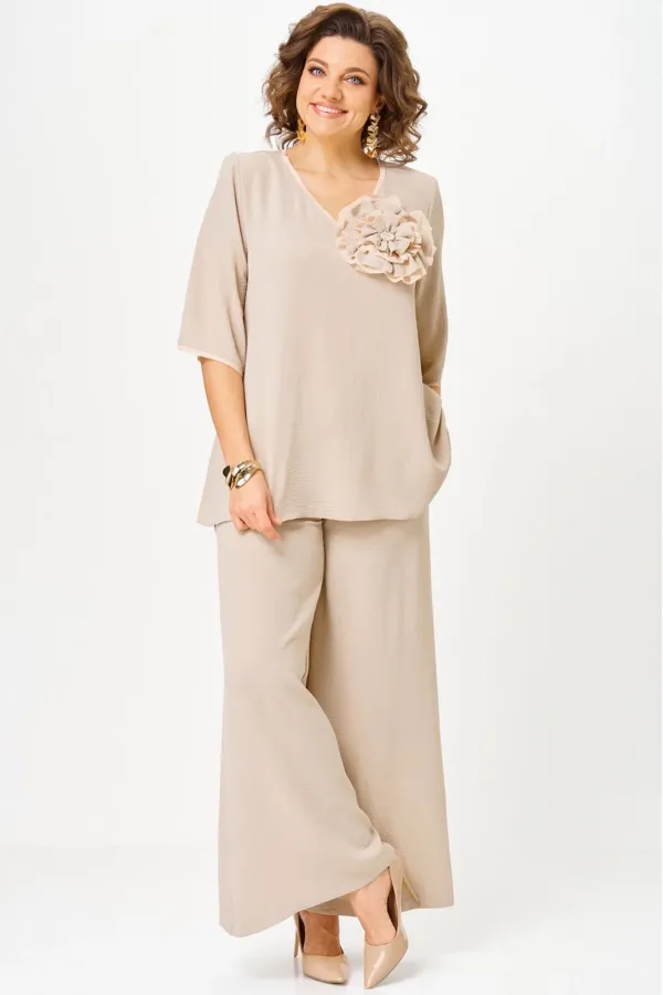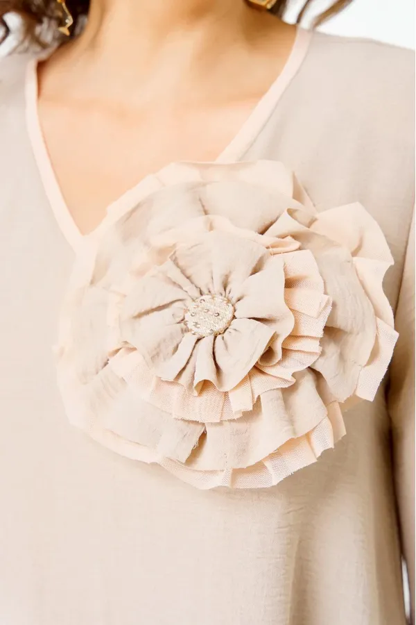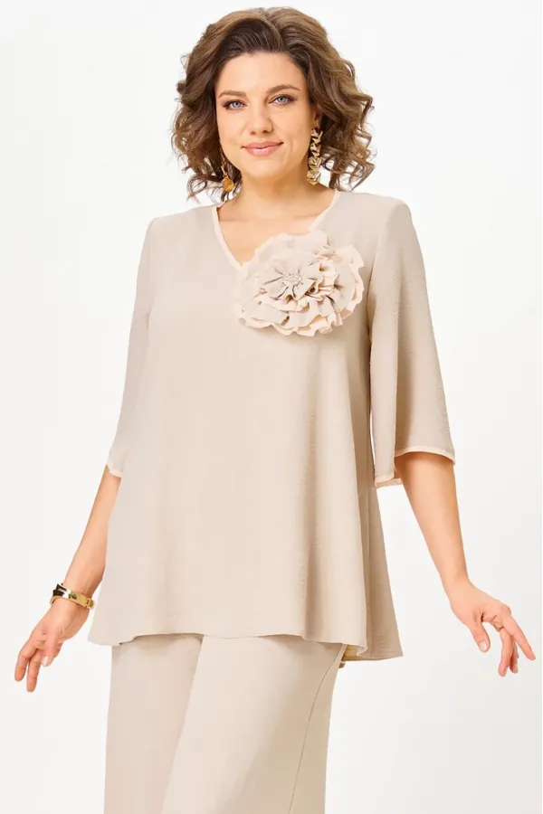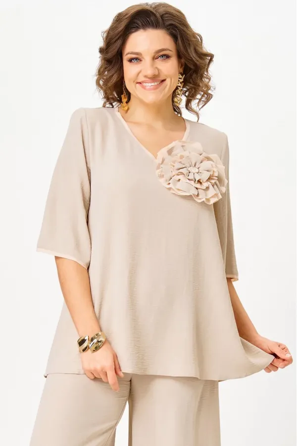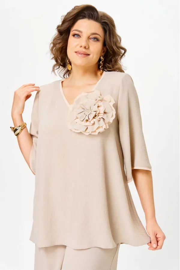 Блузка женская A-силуэта с втачным рукавом. Вырез горловины v- образной формы. Спинка цельная. Рукав длинной 7/8 расширенный к низу. Горловина и рукава по низу оформлены бейкой из отделочной ткани. Украшением служит съемный цветок.