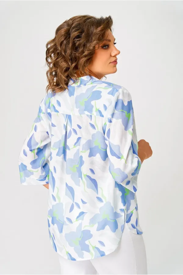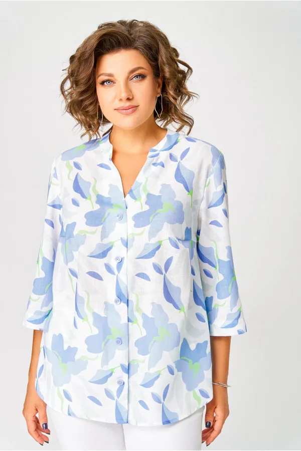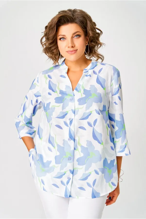 Блузка женская свободного силуэта с центральной застёжкой на петли и декоративные пуговицы, выполнена из льняной ткани с добавлением вискозы. Полочка с нагрудными вытачками. Спинка с отрезной кокеткой и бантовой складкой.