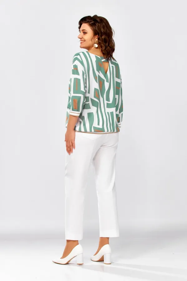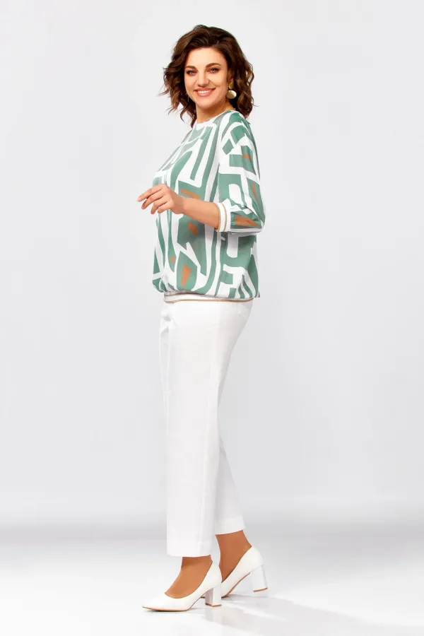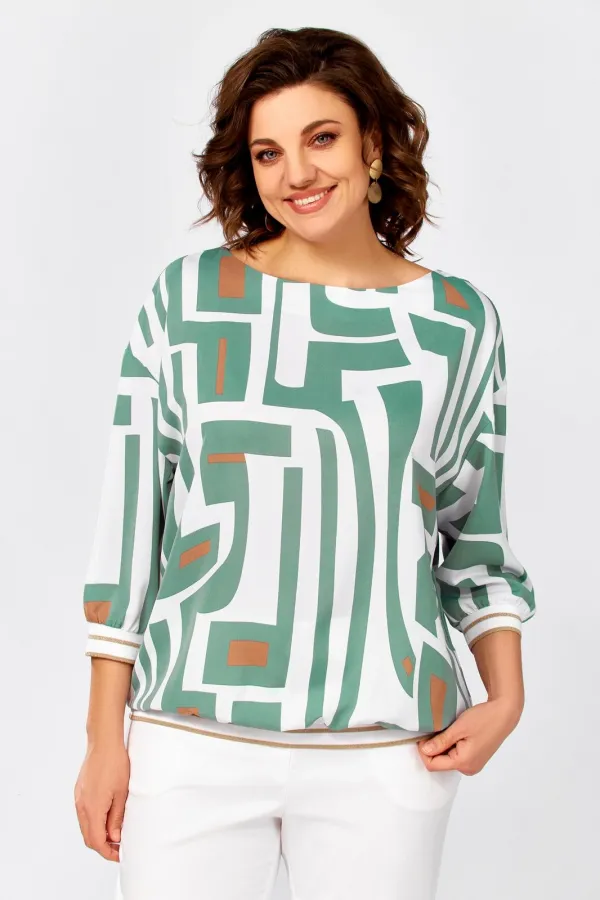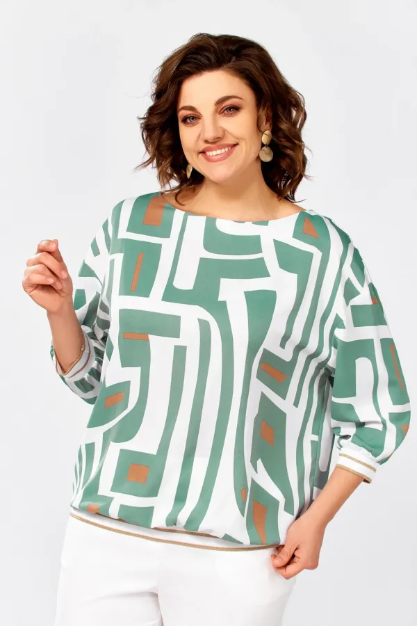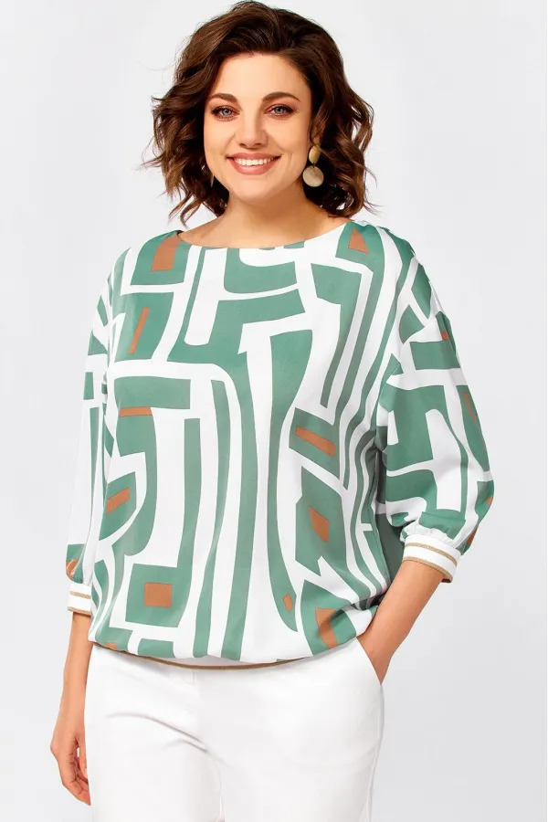 Блузка из мягкой вискозной ткани свободного силуэта со спущенной линией плеча. Горловина по полочке округлой формы, по спинке – V-образный вырез, который соединён планкой. Рукав длиной 3/4. Низ блузки и низ рукавов присобраны на декоративный трикотажный довяз.