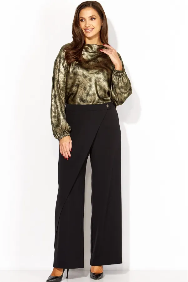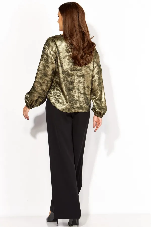 Блузка прямого силуэта с длинным рукавом. Рукав со спущенной линией плеча, мягкой складкой и резинкой по низу. Вырез горловины лодочка По переду в области горловины, мягкие складки (качели) Низ блузки ажурной формы