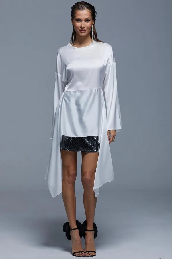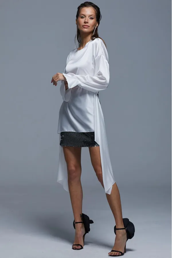 Блузка выполнена из блузочной нарядной ткани, свободного силуэта. Спущенная линия плеча, рукав длинный прямой. Широкий пояс-завязка. По спинке разрез, сверху- петля и пуговица, по низу –завязки. Длина блузки По спинке - 41 см. По переду (от горловины) - 68 см. Длина рукава 76 см. (от горловины).Подробные замеры смотрите на дополнительном фото. Подходит на рост 164-170