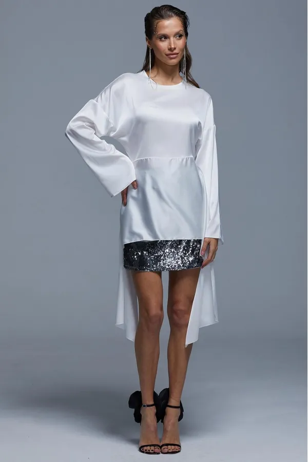 Блузка выполнена из блузочной нарядной ткани, свободного силуэта. Спущенная линия плеча, рукав длинный прямой. Широкий пояс-завязка. По спинке разрез, сверху- петля и пуговица, по низу –завязки. Длина блузки По спинке - ... Читать далее...