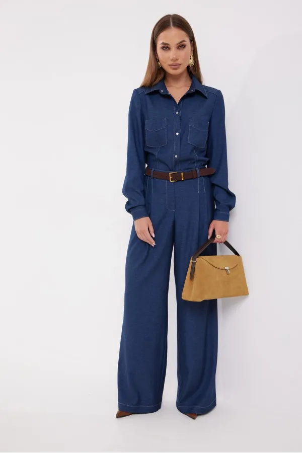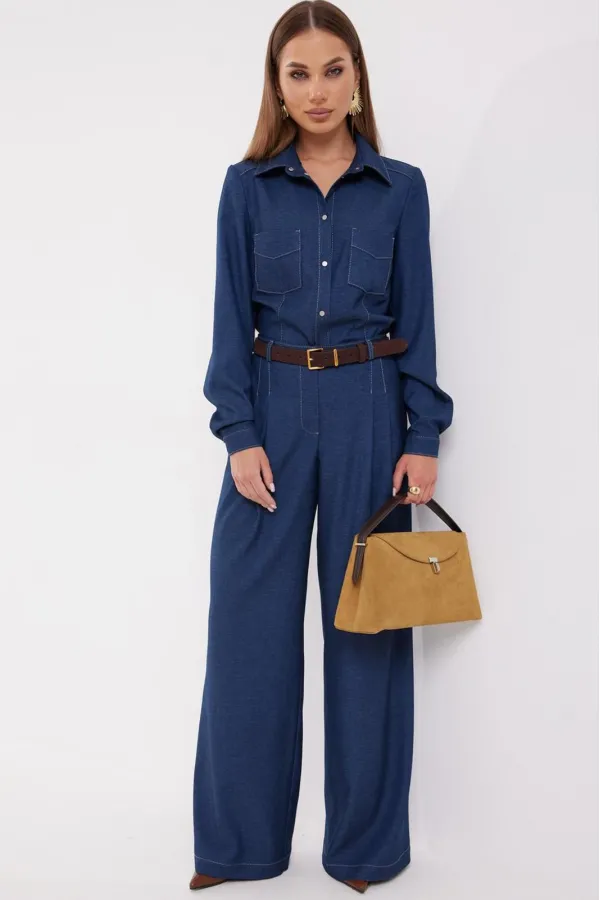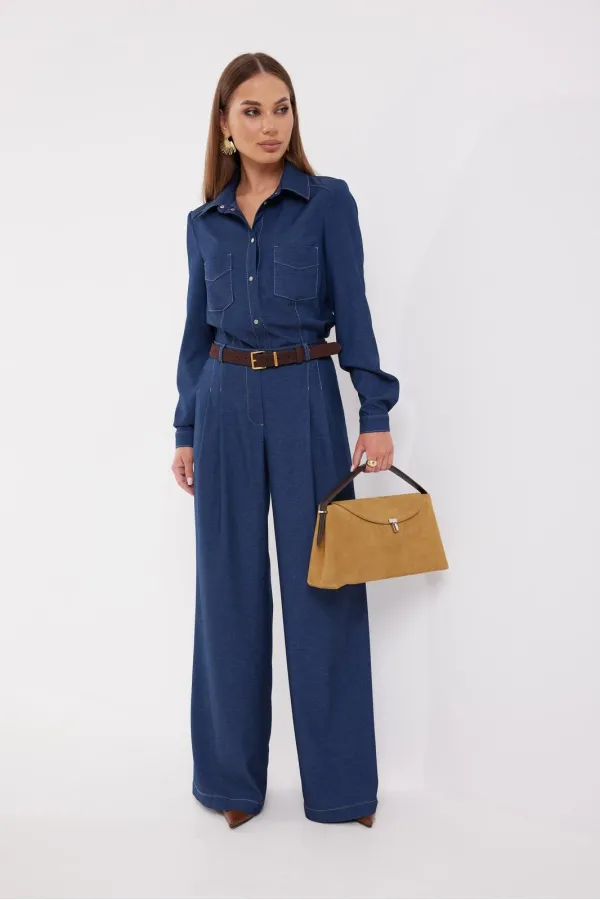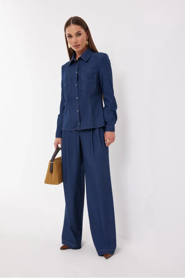 Блузка женская полуприлегающего силуэта, из ткани «под джинс». Застежка центральная на кнопки, рукав втачной одношовный, по низу рукава обработана манжета, застегивающаяся на кнопку. Воротник рубашечный. По переду накладные карманы.