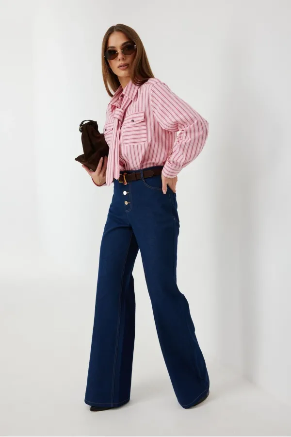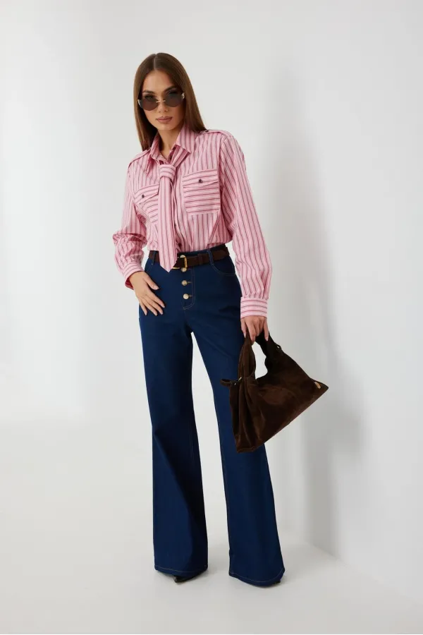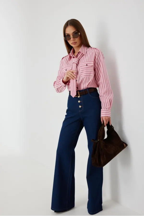 Блузка женская свободного силуэта, из рубашечной ткани в полоску. Спинка с кокеткой. Застежка на петли и пуговицы, по переду накладные карманы с клапанами, по плечевым швам погоны, фиксирующиеся пуговицей, рукав свободный, по низу манжета с пуговицами. В комплекте с блузкой декоративная деталь, завязывающаяся в виде галстука. Воротник рубашечный со стойкой.