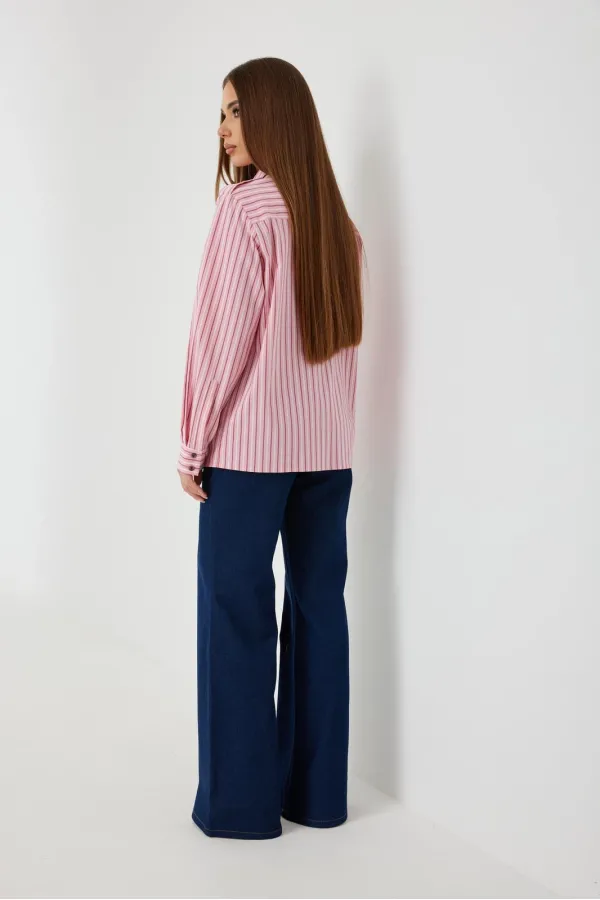 Блузка женская свободного силуэта, из рубашечной ткани в полоску. Спинка с кокеткой. Застежка на петли и пуговицы, по переду накладные карманы с клапанами, по плечевым швам погоны, фиксирующиеся пуговицей, рукав свободны... Читать далее...