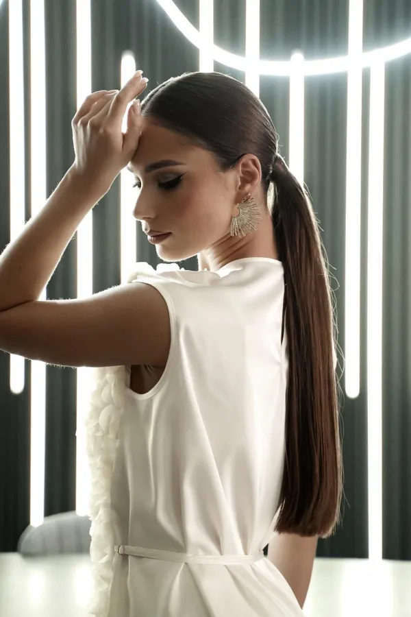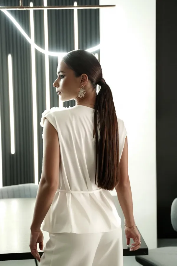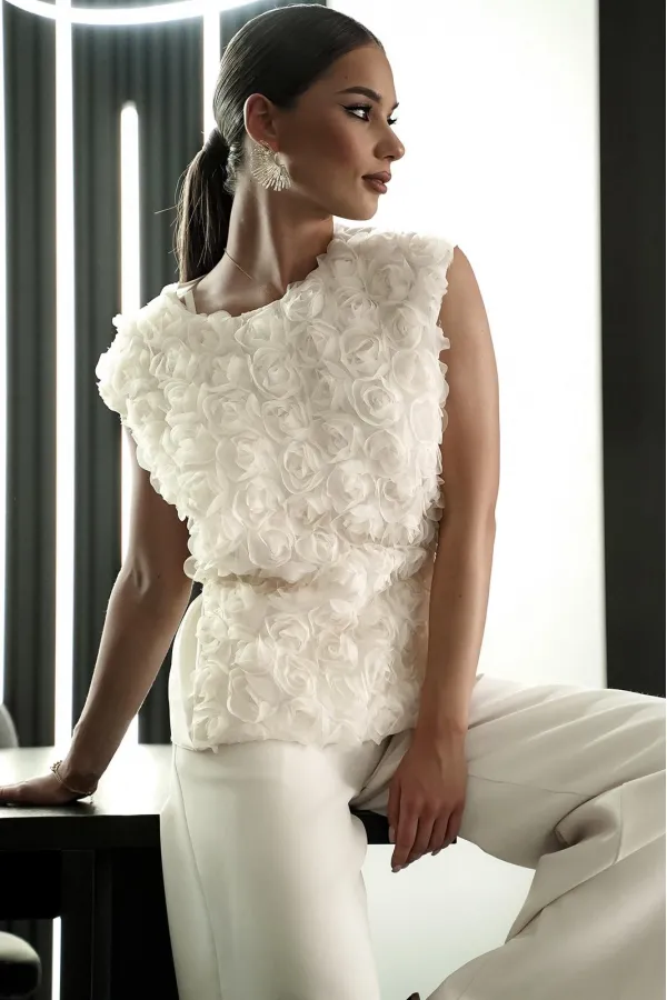 Блузка прямого силуэта со спущенным плечом. Перед из фактурной ткани «розы на сетке», спинка из полупрозрачной ткани «органза». Горловина округлой формы, по спинке застежка на навесную петлю и пуговицу. Перед на атласной подкладке.