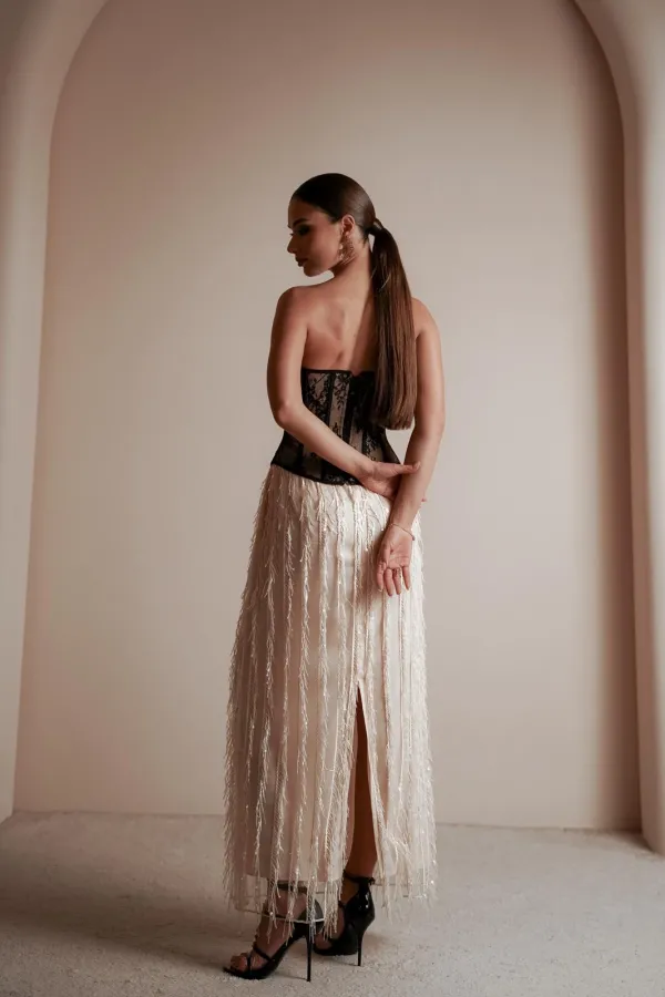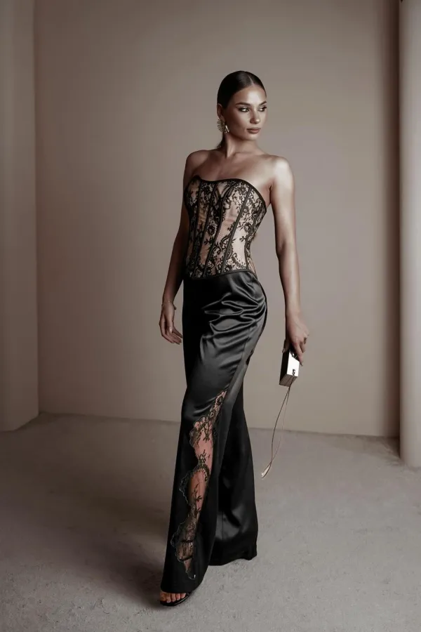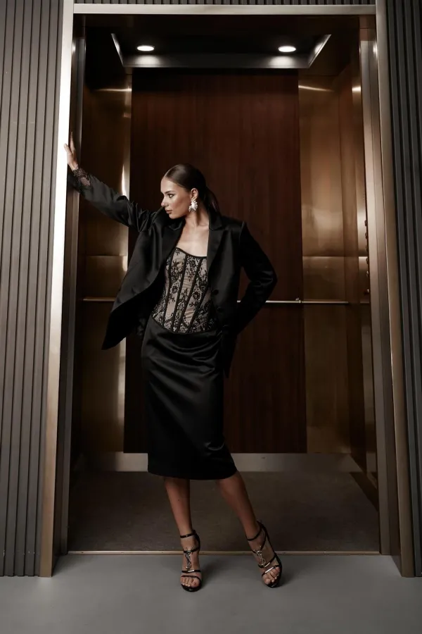 Укороченная блузка из кружева с сатиновой подкладкой, прилегающего силуэта. По спинке шнуровка. По переду и спинке по три рельефных шва. Блузка отлично подойдет для коктейльных и вечерних выходов, ее можно использовать, как самостоятельный предмет одежды или надевать вторым слоем поверх рубашек или платьев.