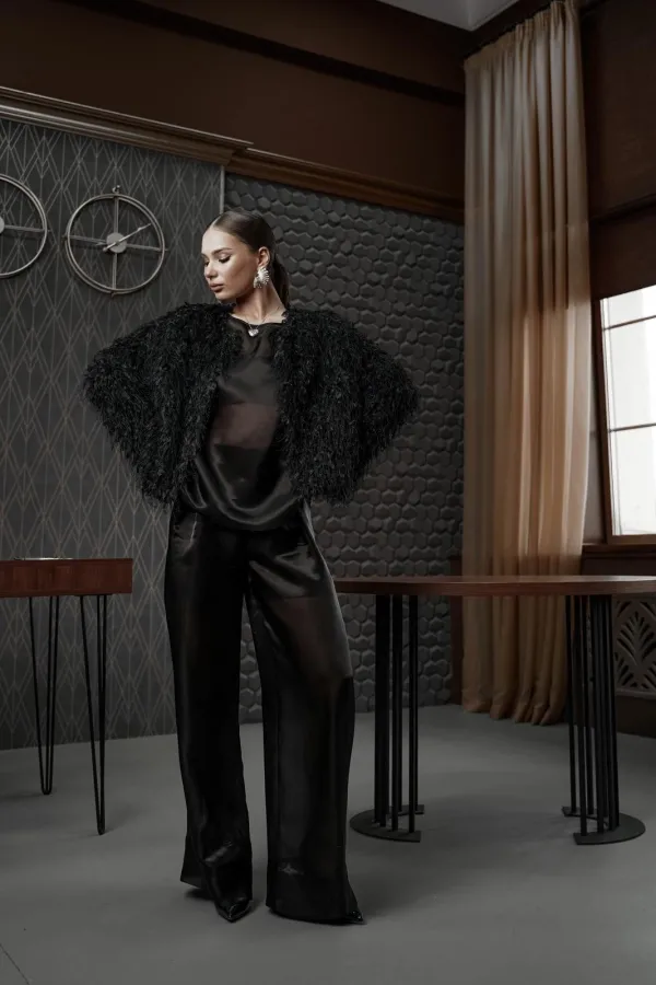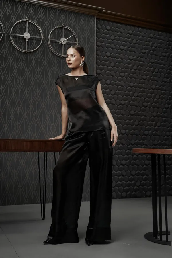 Блузка прямого силуэта со спущенным плечом из полупрозрачной ткани «органза». Горловина округлой формы.