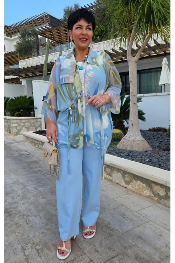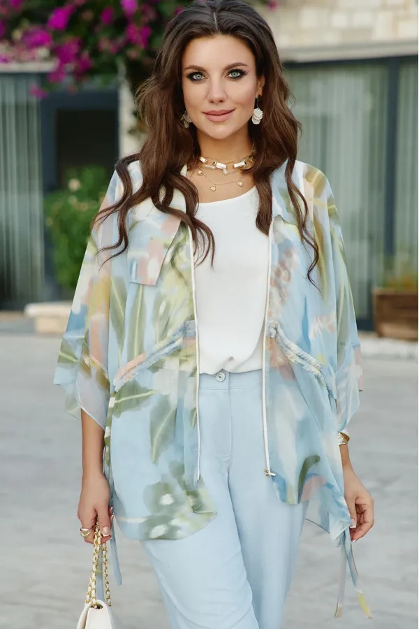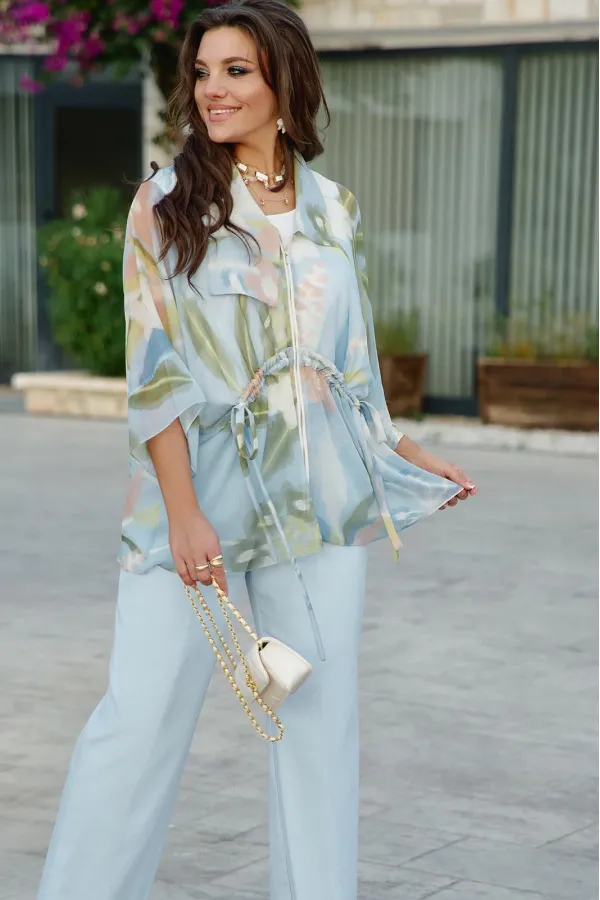Комплект женский, двух предметный, состоящий из блузки и блузы. Этот комплект читает женственность спокойно — без пафоса. Он рассказывает о комфорте, о внимании к текстурам и о желании выглядеть легко, но продуманно. Вместе они создают образ, где современная минималистика встречается с женственной романтикой: практично, но вдохновляюще. Главный акцент комплекта – это невесомая шифоновая блузка с абстрактным цветочным принтом в пастельных тонах, создающая ощущение воздушности и легкости. Ее свободный крой и завязки на талии позволяют регулировать силуэт, добавляя динамичности. Его дополняет базовая белая блуза, которая служит чистым холстом для более яркого элемента. Блузка свободного силуэта, с центральной застёжкой на тесьму молнию по переду; воротник в блузке отложной, ассиметричный. В качестве отделочного элемента по переду блузки - кулиса со шнуром из основной ткани. Рукав цельнокроеный, длиной 7/8, с притачной манжетой. По спинке отрезная кокетка. Низ в блузке ассиметричный. Блуза прямого силуэта с округлой формой горловины и нагрудными вытачками по полочке. Спинка без особенностей. Данный комплект имеет множество вариантов стилизации. Можно неебрежно заправить переднюю часть блузы в джинсы — блузка свободно расправится сверху. Застегнуть молнию наполовину, чтобы создать V-образный переход между шифоном и топом. Длина верхней блузы по центру спинки 75,5 см (р 52-56), 76 см (р 58-62). Длина рукава верхней блузы 56 см (р 52-56), 57 см (р 58-62).Подробные замеры смотрите на дополнительном фото. Подходит на рост 164-170.