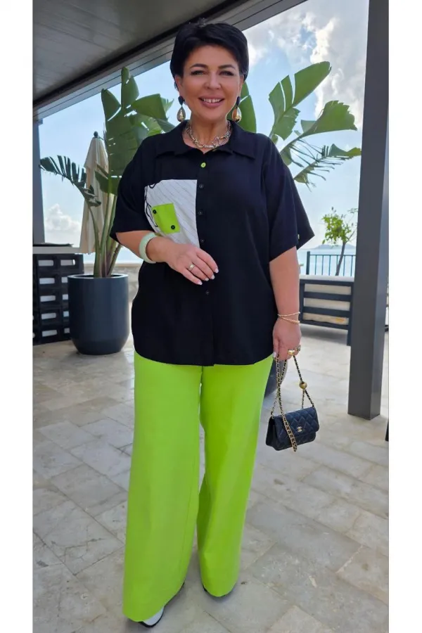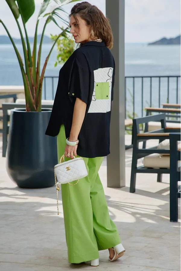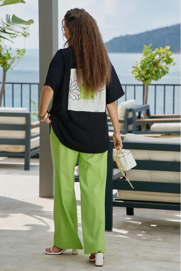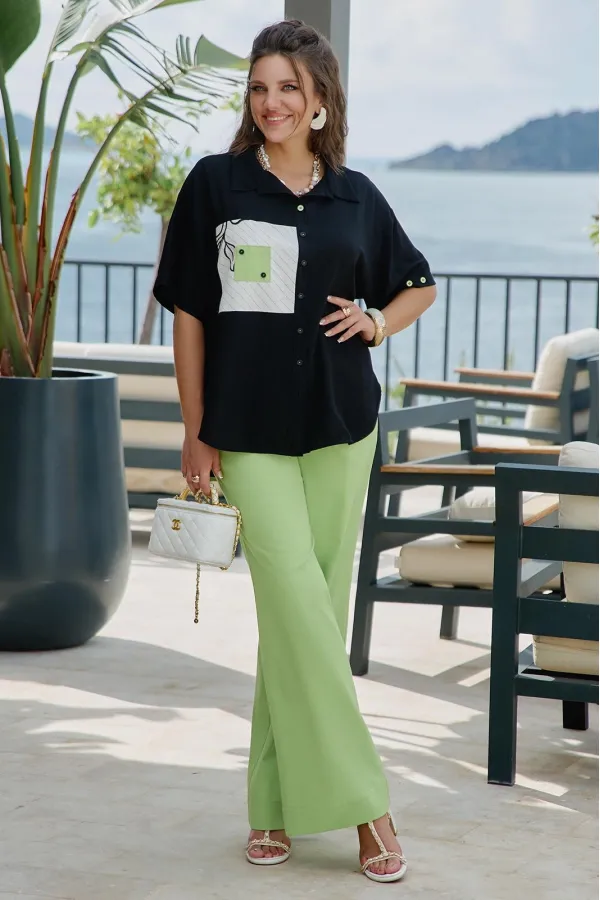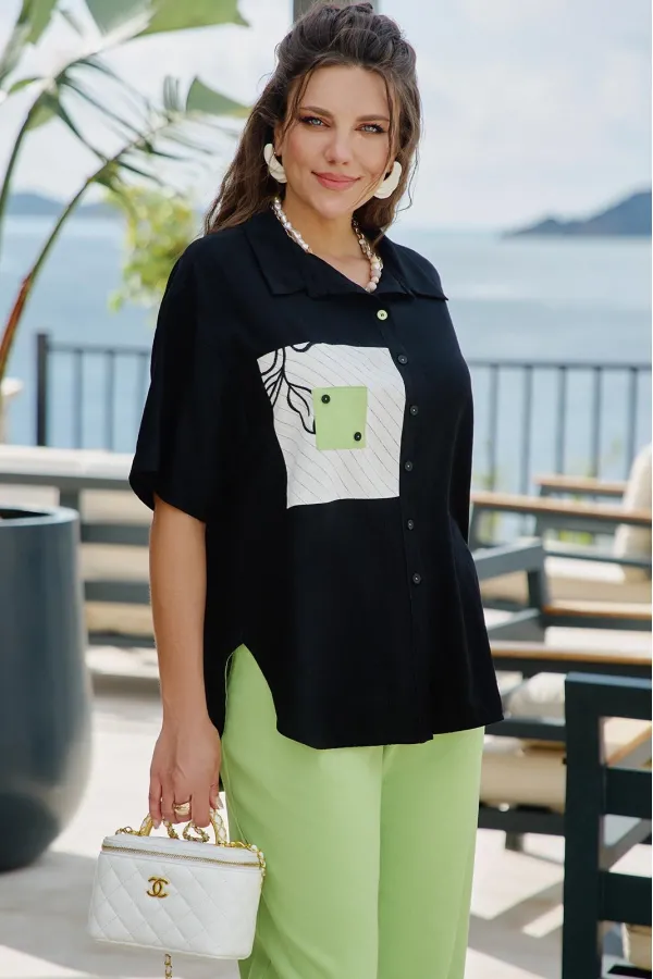 Блузка из чёрного материала становится идеальным фоном для создания базы в гардеробе. Чёрный цвет здесь — не траурный, а драматичный, глубокий, он поглощает свет, чтобы яркие акценты сияли ещё ярче. Эта блузка — не просто предмет гардероба, а инструмент самовыражения. Она достаточно универсальна для офиса, а та же для особых мероприятий. Ключ к успешной стилизации — баланс: позвольте цветочным акцентам быть главными героями образа, а всё остальное пусть будет их достойным фоном. Помните — иногда одна яркая деталь говорит больше, чем целый ансамбль, и эта блузка именно такая деталь. Блузка прямого силуэта с центральной застёжкой на петли-пуговицы по планке, воротником рубашечного типа. По правой детали полочки отрезная кокетка, декоративная вставка из отделочной ткани с ярким акцентом. Линия плеча спущенная, рукав втачной, короткий с декоративным элементом по низу в виде пришивной пуговицы. Спинка в блузке с отрезной кокеткой, декоративной вставкой из отделочного материала с ярким акцентом. Низ в блузке фигурной формы. Длина блузы 80 см (р 52-56), 81 см (р 58-62), длина рукава 21,5 см.Подробные замеры смотрите на дополнительном фото. Подходит на рост 164-170.