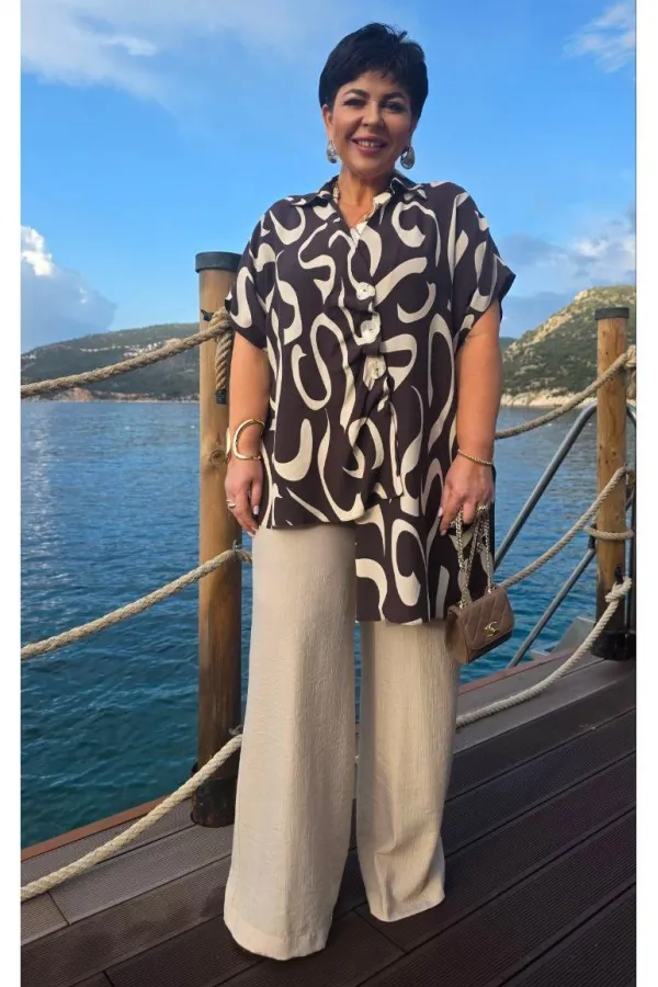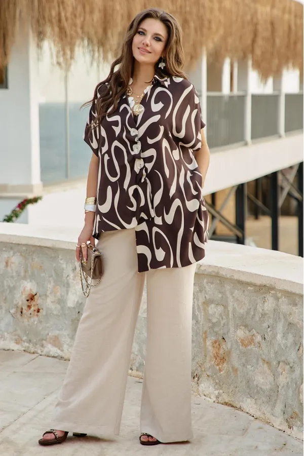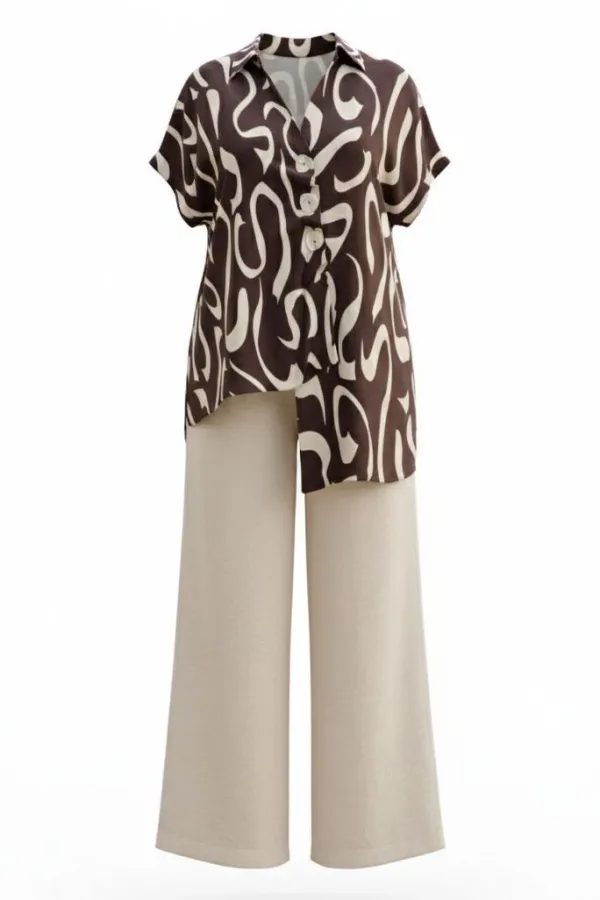 Блузка представлена как многофункциональный элемент гардероба, который сочетает в себе эстетическую глубину и практическую универсальность, становясь холстом для образов. Крой — свободный, но не мешковатый. Универсальность — подходит для работы, встречи с друзьями, прогулки, путешествия. Современность — вне сезонных трендов, но в тренде на осознанное потребление. Блузка не облегает — она скользит. Она не описывает фигуру — она её окутывает. Блузка свободного силуэта с ассиметричной линией борта с заложенными складками, имитацией застёжки на декоративные пуговицы. Горловина в блузке с отложным воротником со стойкой. Рукав в блузке цельнокроеный. Спинка с отрезной кокеткой. Низ в блузке ассиметричный с разрезами в боковых швах. Длина блузки 69 см (р 52-56), 72 см (р 58-62). Длина брюк 108 см.Подробные замеры смотрите на дополнительном фото. Подходит на рост 164-170.