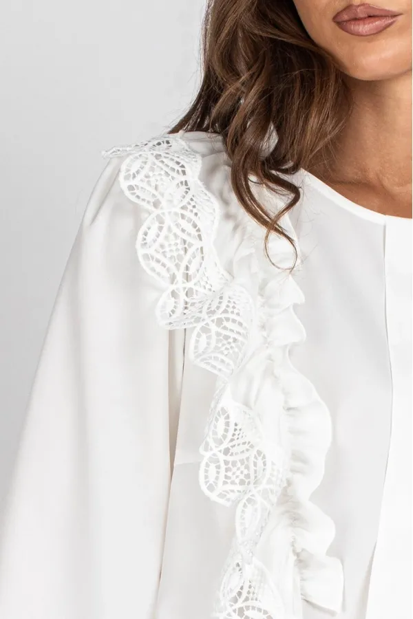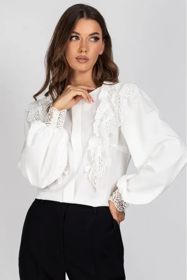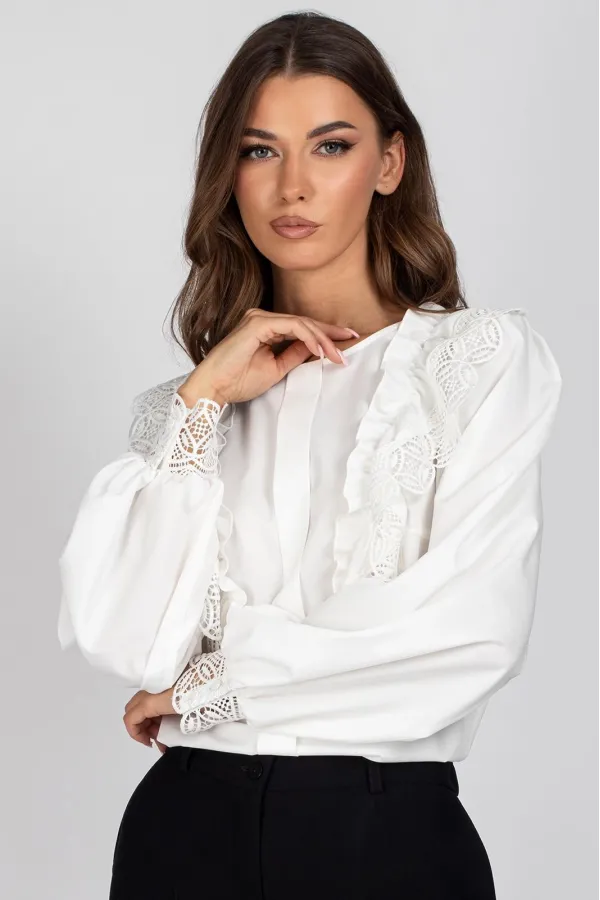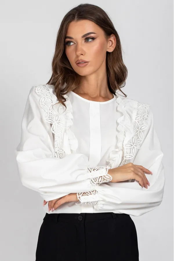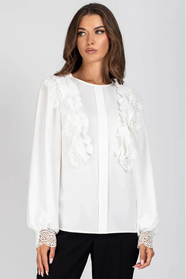 Блузка женская полуприлегающего силуэта. Перед блузы цельный, с нагрудными вытачками и отделочной планкой, с настроченными рюшами с кружевом. Спинка цельная с капелькой и застежкой на навесную петлю и пуговицу. Рукав втачной, присборенный в верхней части оката и внизу.