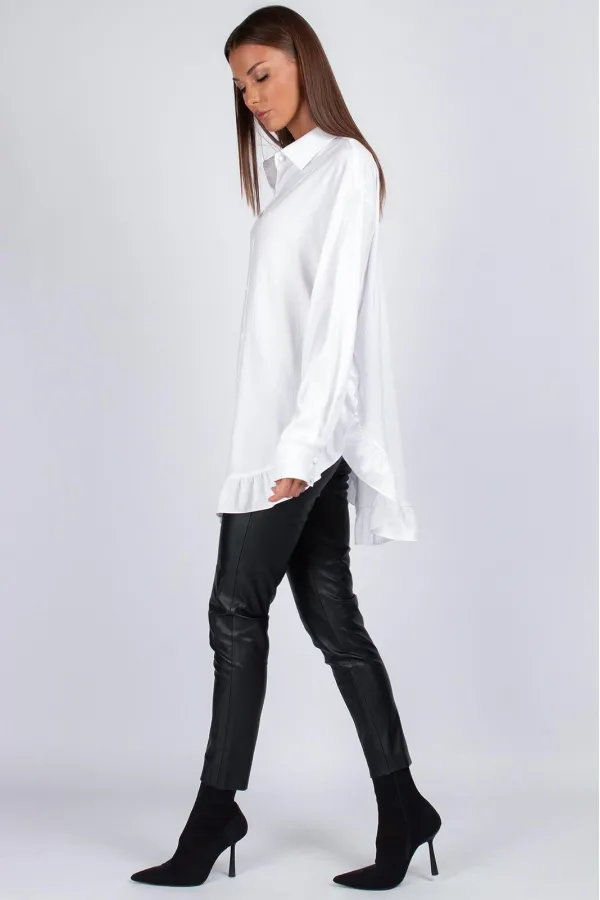 Модель имеет прямой свободный силуэт со спущенным плечом — сидит мягко, не сковывая движений. Перед из двух частей с застежкой на 7 пуговиц создает классическую основу, а главный сюрприз ждет внизу: по низу переда и спинки добавлена притачная рюша. Эта деталь преображает свободную блузку, делая ее кокетливой и нарядной.