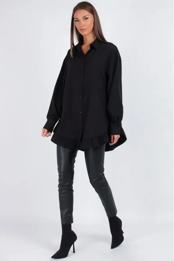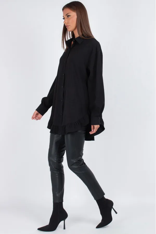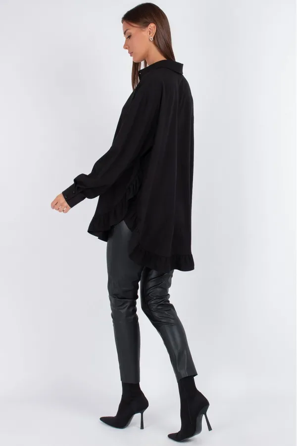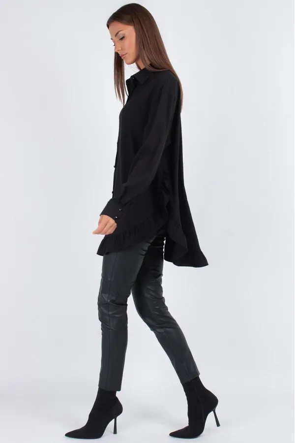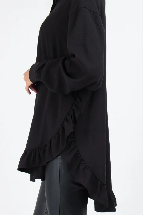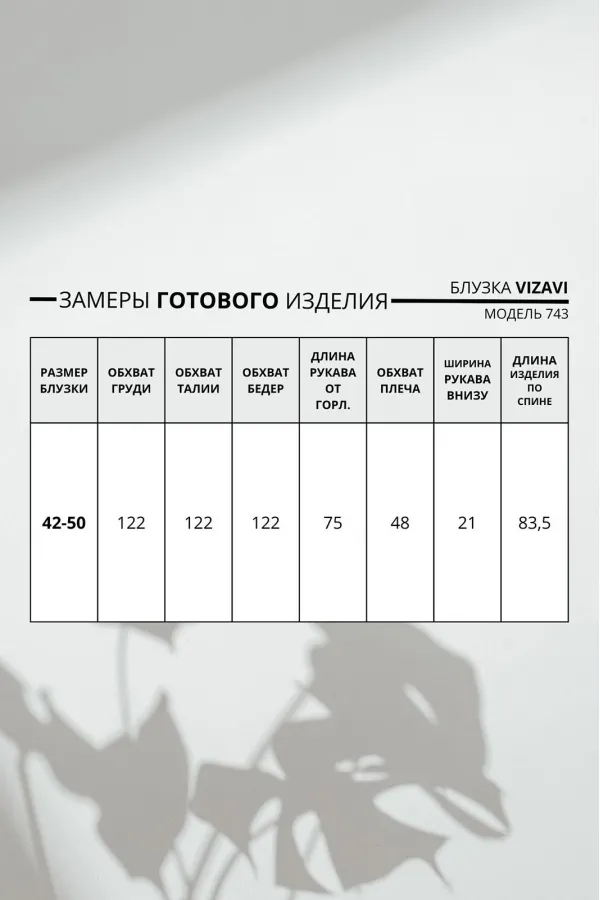 Модель имеет прямой свободный силуэт со спущенным плечом — сидит мягко, не сковывая движений. Перед из двух частей с застежкой на 7 пуговиц создает классическую основу, а главный сюрприз ждет внизу: по низу переда и спинки добавлена притачная рюша. Эта деталь преображает свободную блузку, делая ее кокетливой и нарядной.
