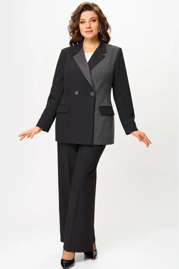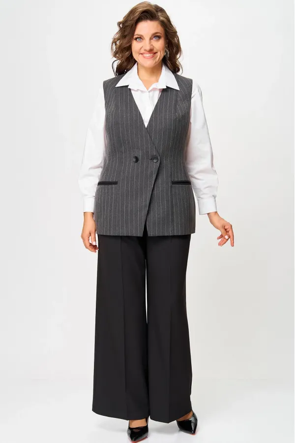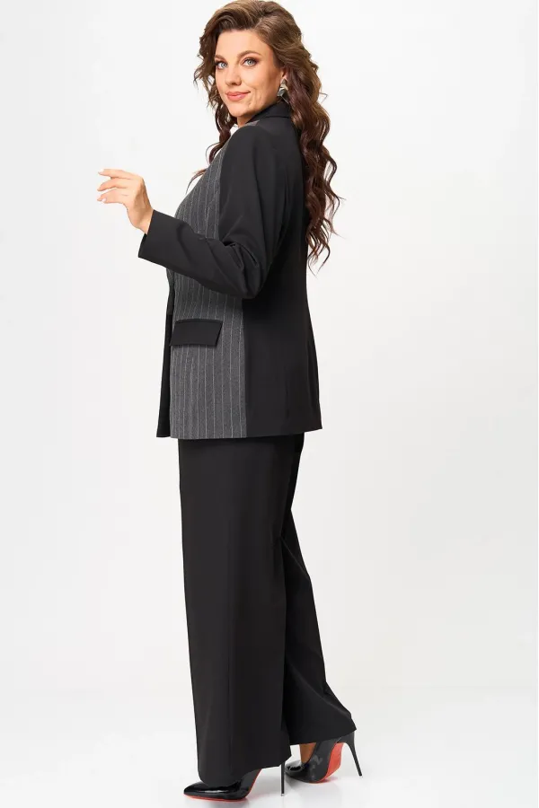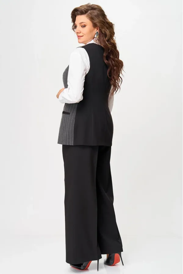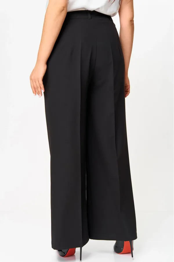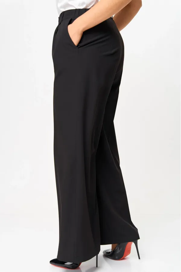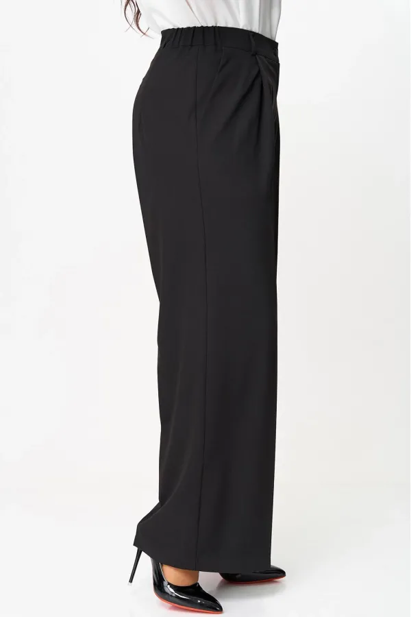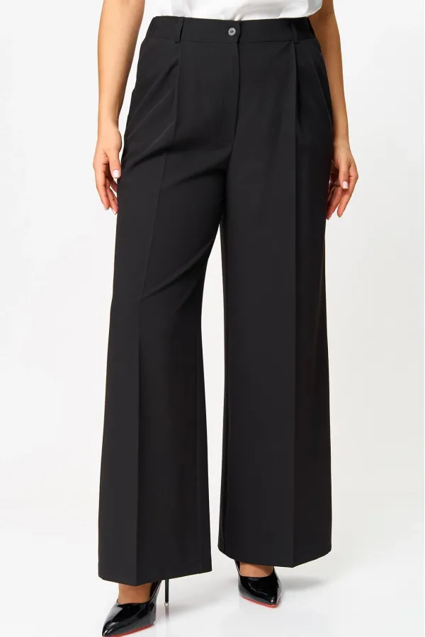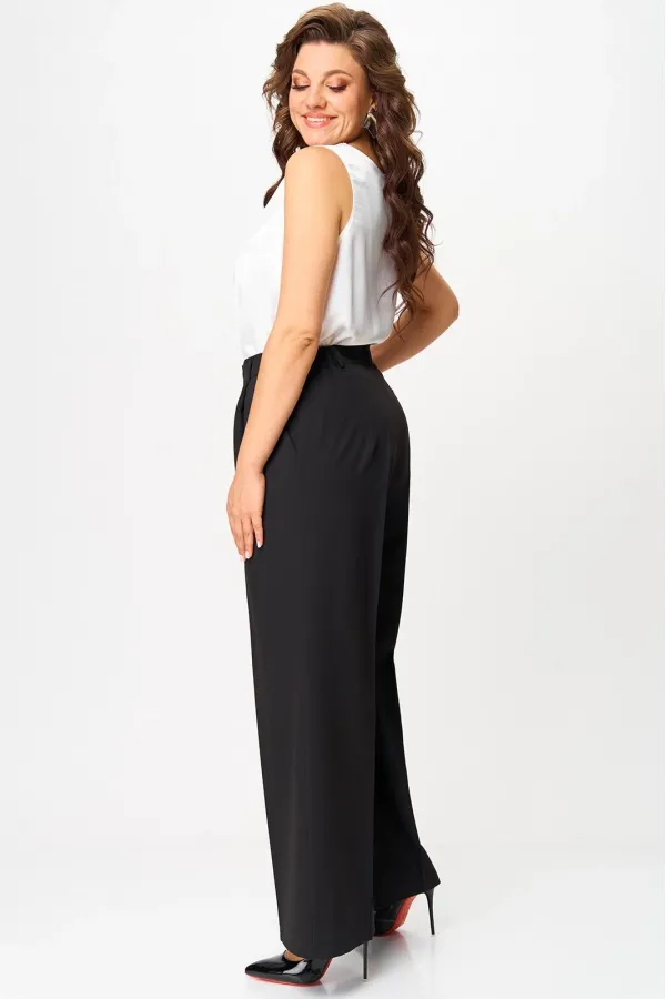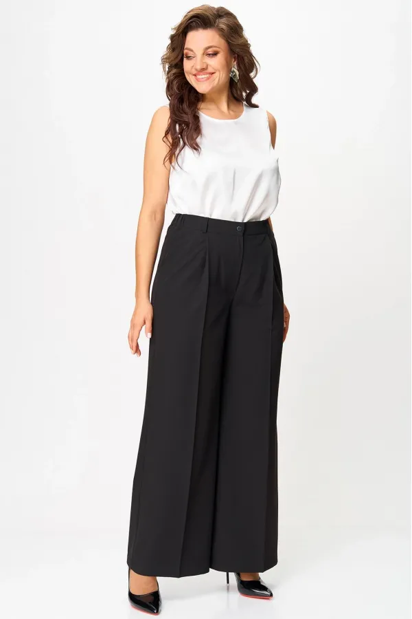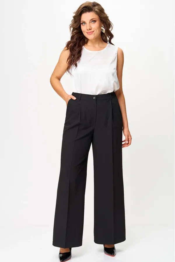 Брюки классические, со стрелками, полной длины, выполнены из однотонной ткани. В области бедер полуприлегающие, в колене и по низу прямые. По передним половинкам обработаны складки по линии талии и наклонные карманы, в среднем шве застежка на молнию. По задним половинкам обработаны талиевые вытачки. Брюки на притачном поясе с эластичной тесьмой и застежкой на петлю и пуговицу.
