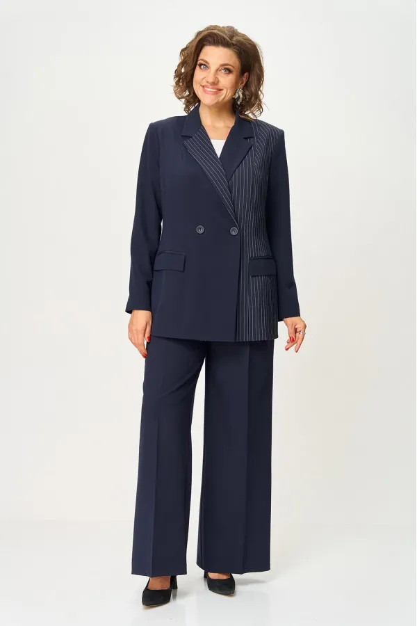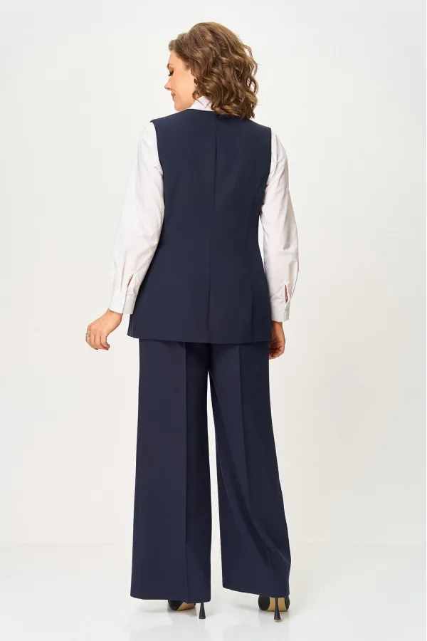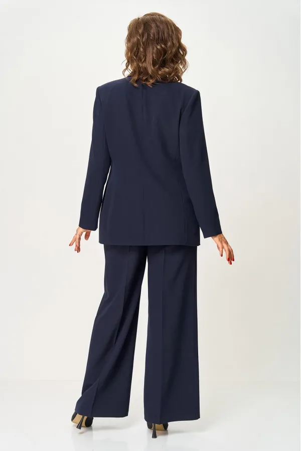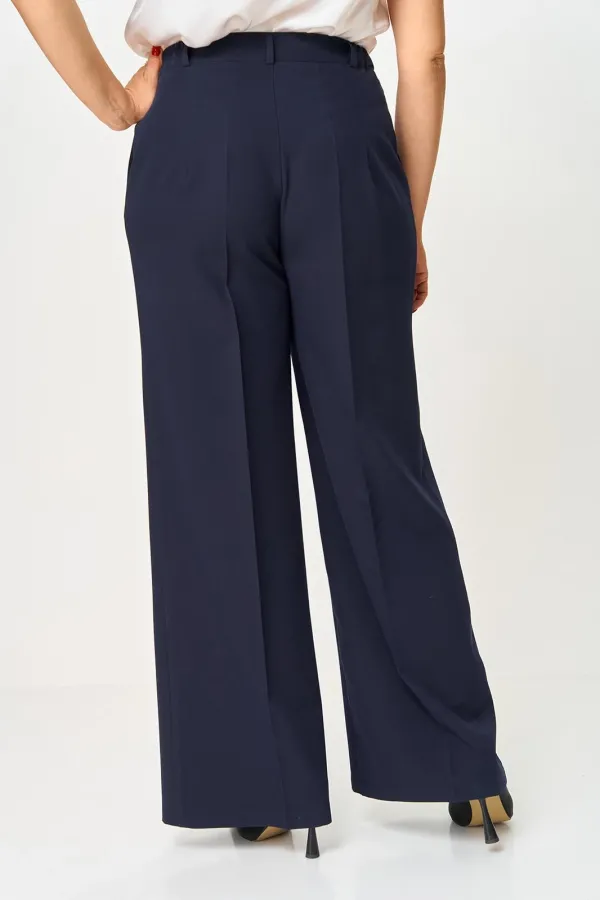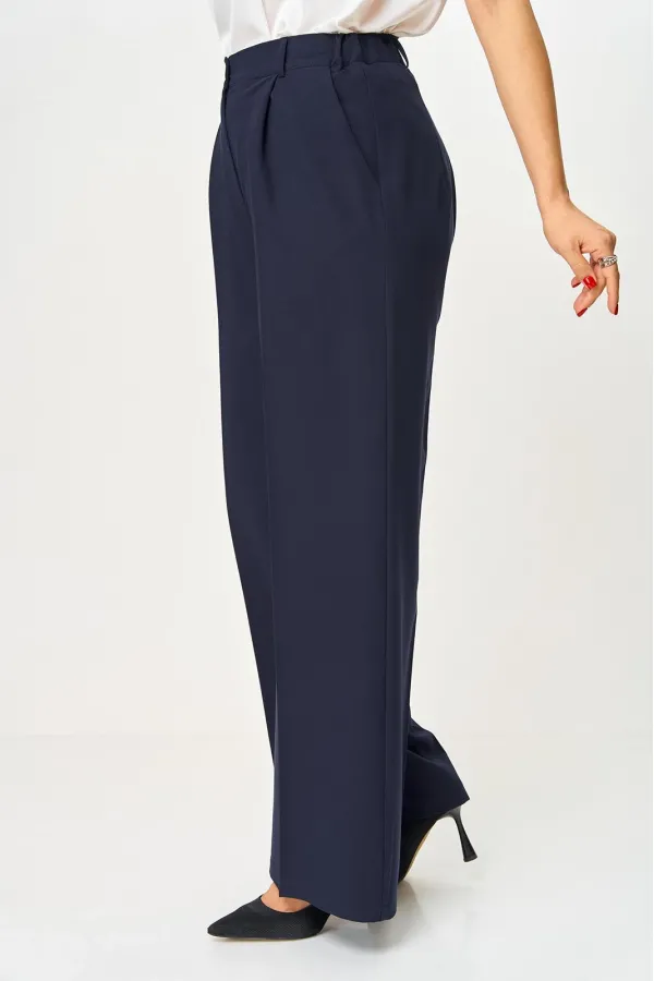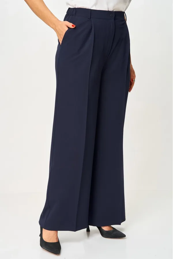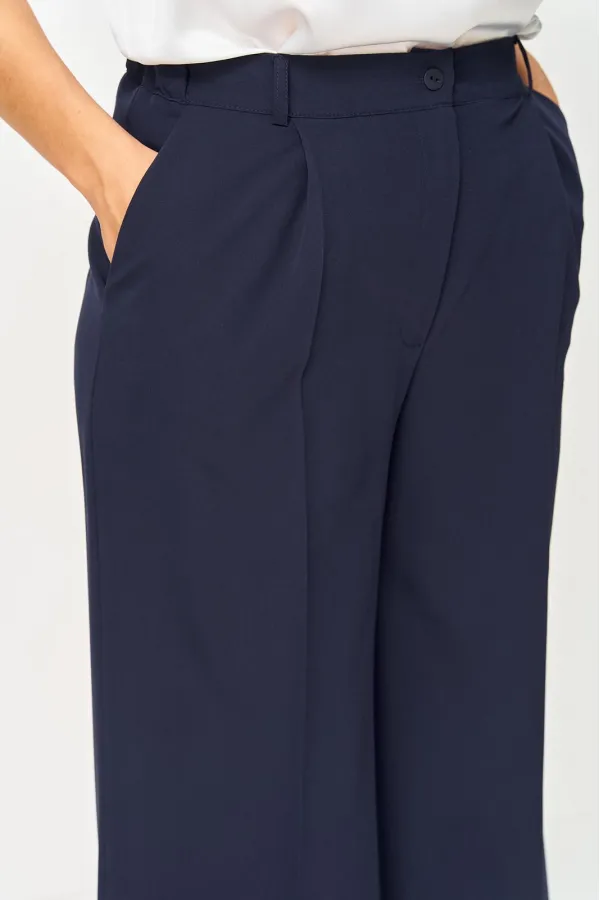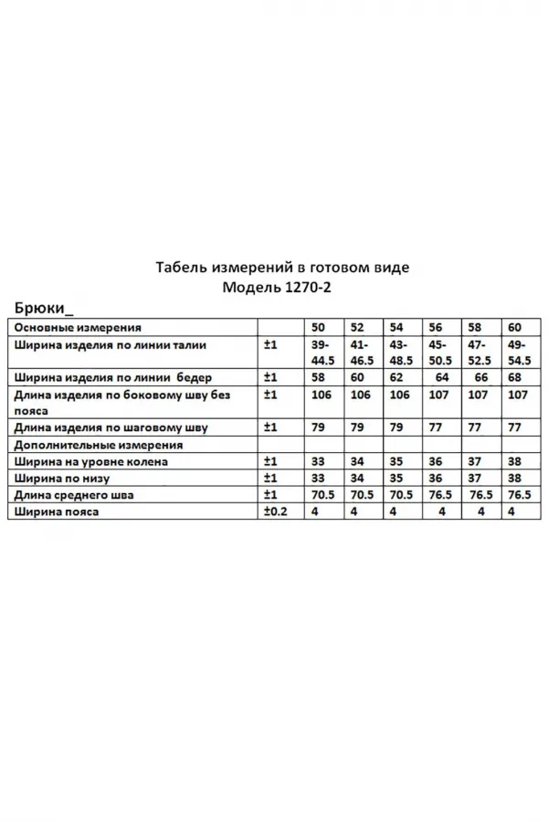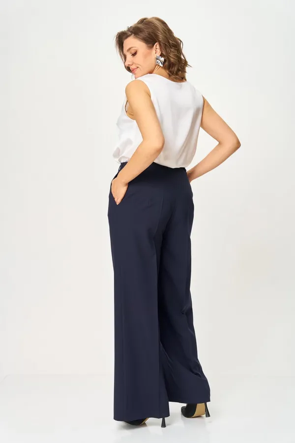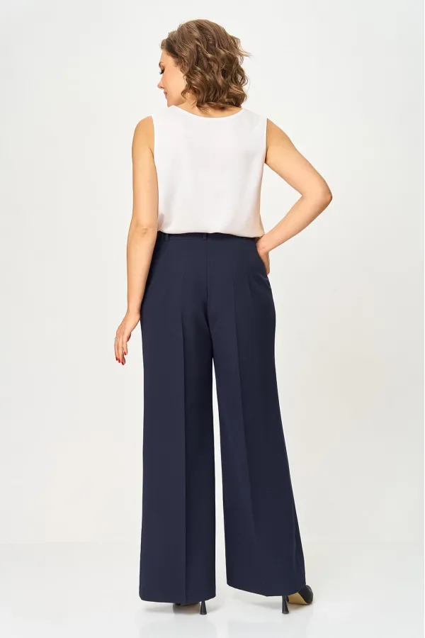 Брюки классические, со стрелками, полной длины, выполнены из однотонной ткани. В области бедер полуприлегающие, в колене и по низу прямые. По передним половинкам обработаны складки по линии талии и наклонные карманы, в среднем шве застежка на молнию. По задним половинкам обработаны талиевые вытачки. Брюки на притачном поясе с эластичной тесьмой и застежкой на петлю и пуговицу.