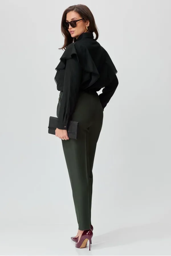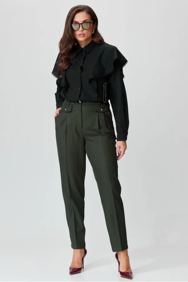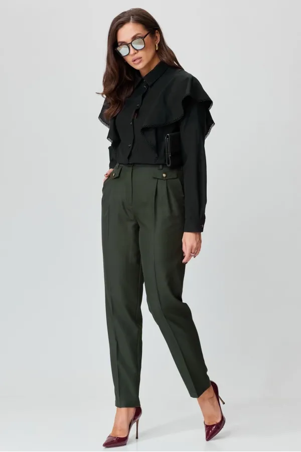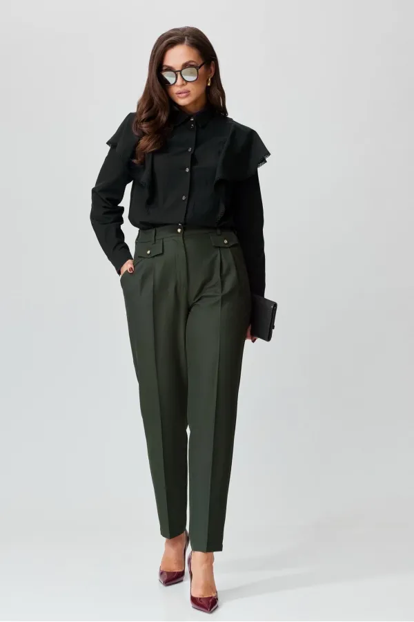 Перед со складками, боковыми карманами и отделочными клапанами. Застежка на тесьму-молнию спереди и петлю и пуговицу по поясу, пояс с эластичной резинкой сзади