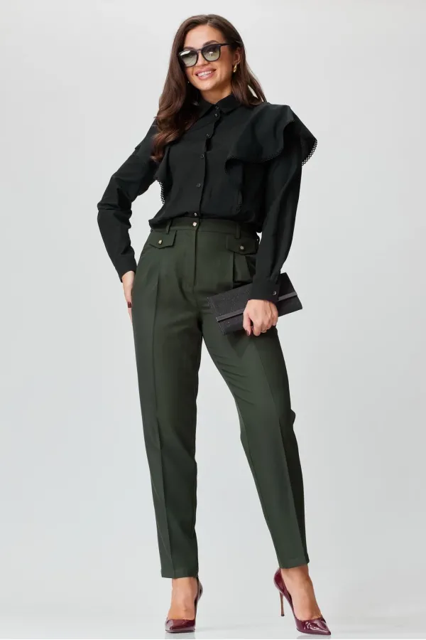 Брюки женские, выполнены из костюмной ткани. Перед со складками, боковыми карманами и отделочными клапанами. Застежка на тесьму-молнию спереди и петлю и пуговицу по поясу, пояс с эластичной резинкой сзади... Читать далее...