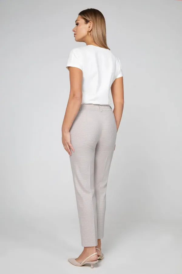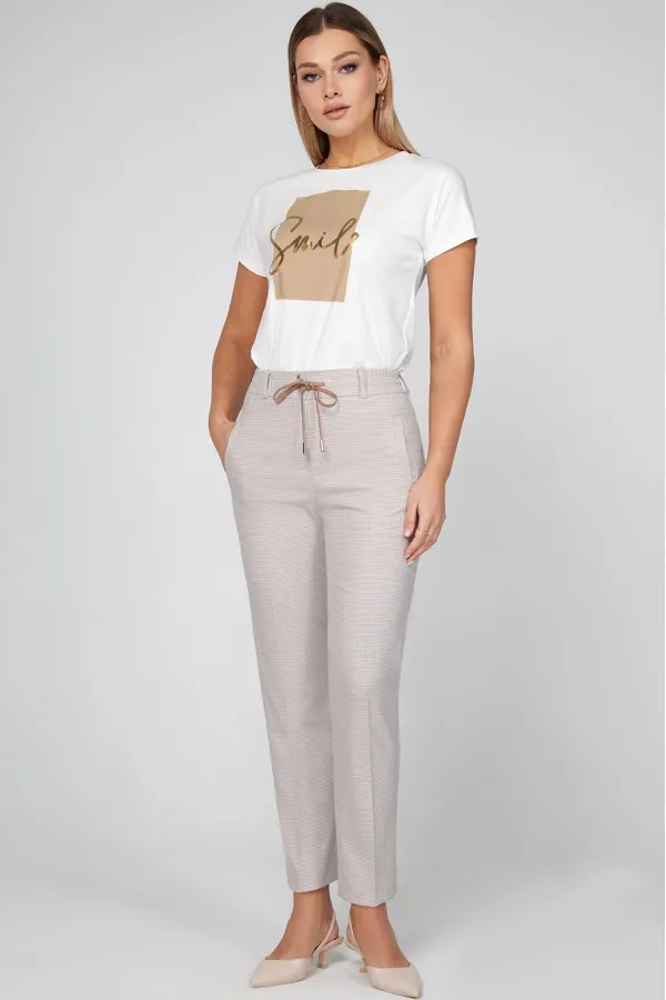 Лаконичные брюки со стрелками выполнены из приятной к телу испанской ткани с добавлением вискозы с интересным контрастным узором в виде мелкой гусиной лапки. Модель на притачном поясе с застежкой на молнию и петлю- пуговицу и дополнена кулисой и практичными вертикальными карманами с листочками. Эластичная часть пояса обеспечивает комфортную посадку на талии. Брюки отлично комплектуются с рубашкой или свитшотом из коллекции, формируя стильный сет на каждый день.