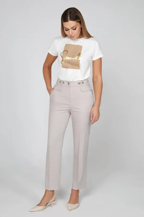 Эти элегантные брюки предлагают идеальный симбиоз стиля и функциональности. Притачной пояс, частично собранный на эластичную тесьму, застёжка на молнию и петлю-пуговицу и боковые косые карманы дополняют образ практичной функциональностью, а задний карман с листочкой и передние декоративные клапаны в сочетании с интересным решением отделки пояса, подчёркивают шикарный вид этих брюк. Данная модель классической длины со стрелками особенно хорошо смотрятся в качестве брюк для костюма и подходит как и для повседневных стилей, так и для офиса.